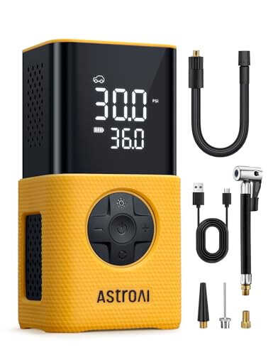 The AstroAI Tire Inflator L7S Portable Air Compressor offers a fast, reliable, and convenient inflation solution for your vehicles. Its advanced "TrueGauge" display provides highly accurate readings thanks to upgraded tire pressure sensors that collect data at 200 samples/second, boasting a valid data rate of over 80%, 60% higher than the market average. This ensures you have the correct pressure values for a safe driving experience. With a maximum pressure of 150 PSI and an airflow of 17L/min, it inflates twice as fast, filling a 195/65R15 tire from 30 PSI to 36 PSI in just 1.5 minutes. Highly portable at only 1.01 pounds (5.31*2.71*2.04 IN), this compressor can be easily stored in car trunks, bike racks, or backpacks. Its built-in 4000mAh large-capacity battery allows you to inflate up to 8 tires (195/65R15) from 30-36PSI on a single charge. The preset function and automatic shut-off feature provide a hands-free inflation experience. With a single button, you can easily inflate car tires, motorcycle tires, bicycle tires, balls, and more. (Note: Not compatible with heavy-duty tires like those on off-road vehicles, RVs, trucks, and trailers.) Choose from 5 smart modes (car, motorcycle, bicycle, ball, and custom) and 4 pressure units (PSI, Bar, kPa, kg/cm²) to meet your various inflation needs. The custom mode allows you to freely preset the desired pressure value (3-150PSI) according to the inflatable product you want to inflate. The outer silicone sleeve protects against accidental drops, extending the device's lifespan. The AstroAI Tire Inflator L7S is not just an air pump, but also a multifunctional emergency tool. The flashlight on top features 3 modes (flashlight, SOS, and strobe) to illuminate the night for easy use. Equipped with USB-C and USB input/output ports, this air compressor provides backup power for your phones and other electronic devices. This compact and powerful device is a reliable companion on the road or at home.