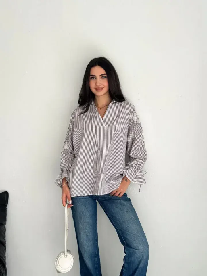 Asymmetrical Back Slit Cut Detailed Striped Blouse Shirt - Gray is a candidate to be one of the indispensable pieces of your wardrobe! This blouse shirt, which offers both a stylish and comfortable look, attracts attention with its unique design. The eye-catching striped pattern helps you create a modern and dynamic style, while the asymmetrical cut and slit detail add a feminine touch. This blouse shirt is a perfect option for both daily use and special occasions. Whether you combine it with jeans for a casual elegance, or get a more sophisticated look with a skirt and high heels. It will highlight your style in every situation. Thanks to its high-quality fabric, this blouse shirt offers comfortable use all day long and is long-lasting and durable. The breathable structure of the fabric allows you to feel cool and refreshed even in hot weather. The gray color offers you a wide range of use by adapting to all kinds of combinations. The M/38 size on the model will help you better understand how the blouse will look on you. The model's measurements (Chest: 90, Waist: 72, Hips: 100) with a height of 165 cm and a weight of 55 kg will guide you in choosing the right size. This blouse shirt will not only make you look stylish, but also make you feel good. The asymmetrical cut and slit detail gently emphasize your body lines, while the striped pattern adds an energetic touch. Reflect your style and make a difference in every environment with the Asymmetrical Back Slit Cut Detailed Striped Blouse Shirt - Gray. This unique design is not just a blouse shirt, but also a style statement. You can always look stylish and unique with this piece that should definitely be in your wardrobe. Order now and enjoy this unique blouse shirt!