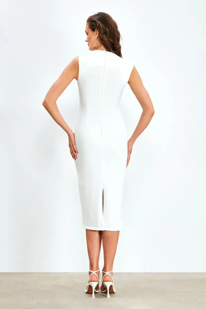 Asymmetric neckline, sleeveless, back zipper closure, back slit detail, stretchy, midi length dress. Length: 118 cm. The product on the model is size 36/S. Model Measurements Height: 1.76, Bust: 83, Waist: 60, Hips: 90
