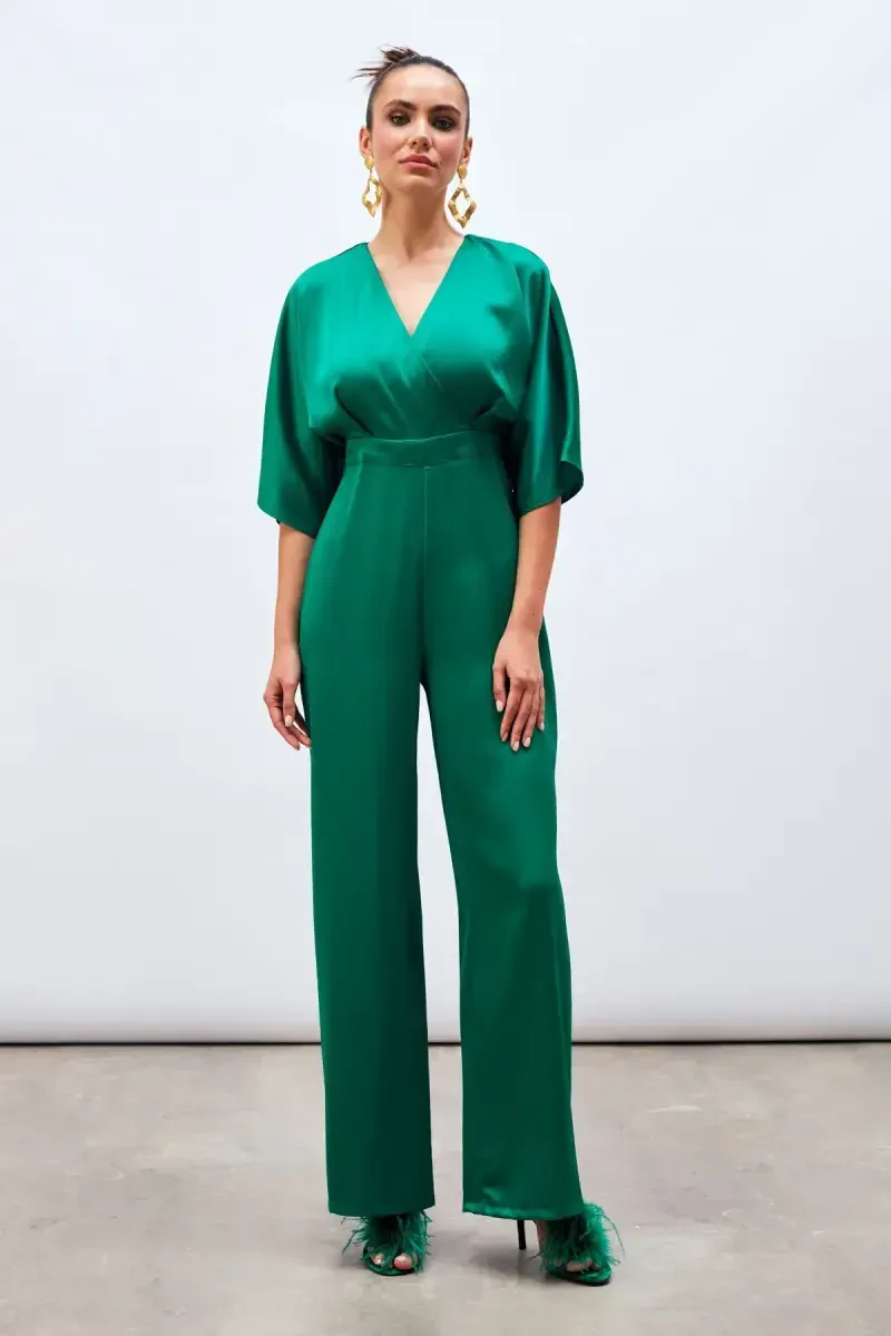 The Wrap Over Loose Jumpsuit will add vibrancy to your wardrobe with its emerald green color and complement any outfit. Order now and experience your style!