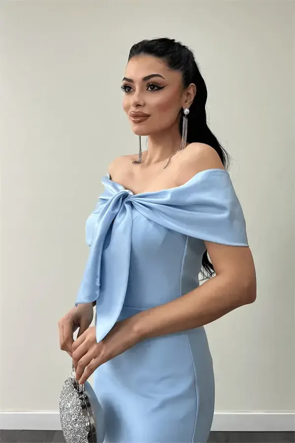 The Atlas Fabric Ribbon-Detailed Collar Pencil Dress is a design that combines elegance and style, allowing you to shine at special events and gatherings. Representing innocence and grace with its baby blue color, this dress offers a unique look by blending with the luxurious texture of atlas fabric. The pencil skirt cut perfectly accentuates your body lines, while the ribbon-detailed collar adds a romantic and feminine touch to the dress. The dress's 105 cm length from the chest provides an ideal proportion, ensuring you feel comfortable and stylish in any setting.The dress can be easily put on and taken off thanks to its back zipper design. The lining inside provides comfortable use throughout the day while enhancing the harmony of the atlas fabric with your skin. The bustier and boning details in the chest area give the dress an extra shape, helping you create a more upright and elegant silhouette. Thanks to its full-fit cut, it fits your body perfectly and does not restrict your freedom of movement. The fabric's lack of elasticity ensures the dress retains its shape, offering long-lasting use.The 30 cm slit on the skirt adds a modern touch to the design while also providing ease of movement. The slit detail adds a sophisticated touch to the dress, highlighting your style. The Atlas Fabric Ribbon-Detailed Collar Pencil Dress is a versatile piece that you can choose for many different events, from special invitations to cocktail parties, graduation ceremonies to weddings. It allows you to draw attention in any environment you enter by highlighting your elegance and grace. This unique design will be an indispensable part of your wardrobe and will always make you feel special. With the calming effect of the baby blue color, it will add a different dimension to each of your combinations and help you reflect your style. It is an ideal choice for women who do not want to compromise on their elegance while creating unforgettable memories.