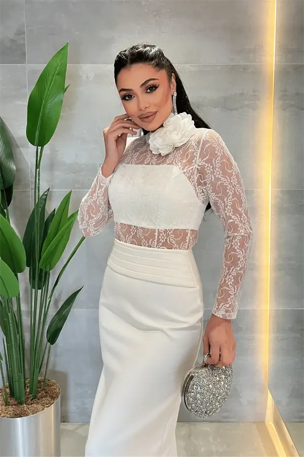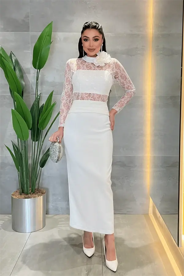 Atlas Kumaş Dantel Detaylı Elbise - BEYAZÜrün Uzunluğu: Göğüsten 130 cm. 'dir. (1-3 cm. arası değişiklik gösterebilir.)Kumaş Türü: Atlas KumaşÜrün Arkadan Fermuarlıdır.Üründe Gögüslük Mevcuttur.Üründe Astar Mevcuttur.Tam Kalıptır, Hafif Esneme Yapar.Gül Detayı Çıkabilmektedir.Modelin Ölçüleri: Boy: 1.68 cm. , Kg: 52 , Göğüs: 85, Basen: 90