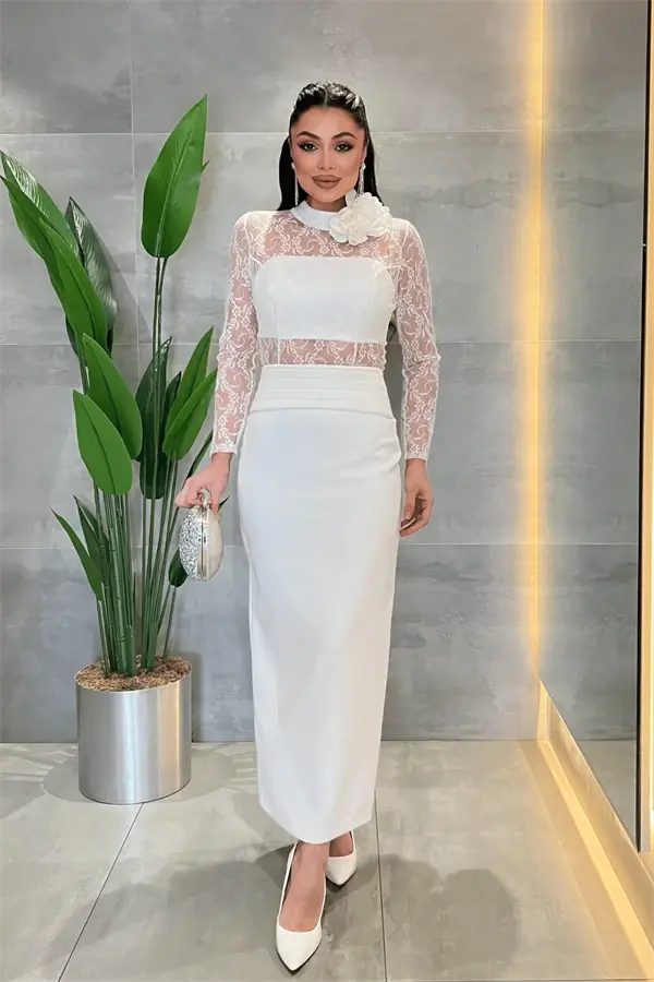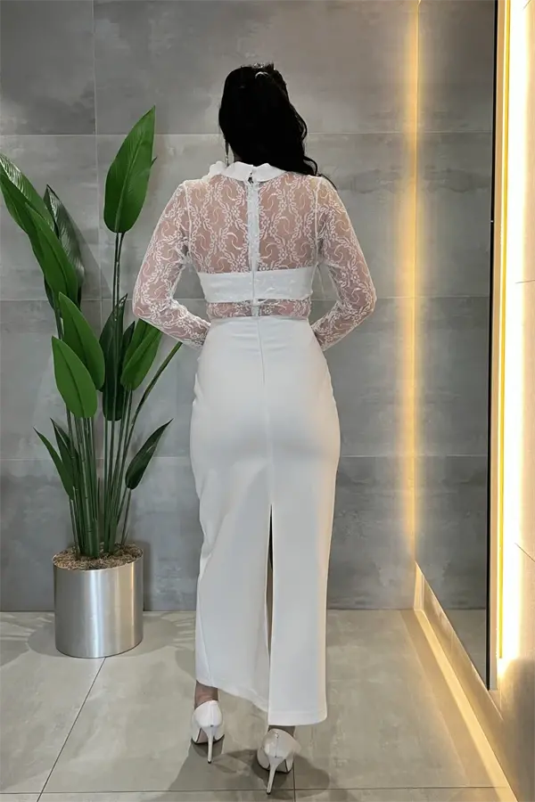 Atlas Kumaş Dantel Detaylı Elbise - BEYAZ