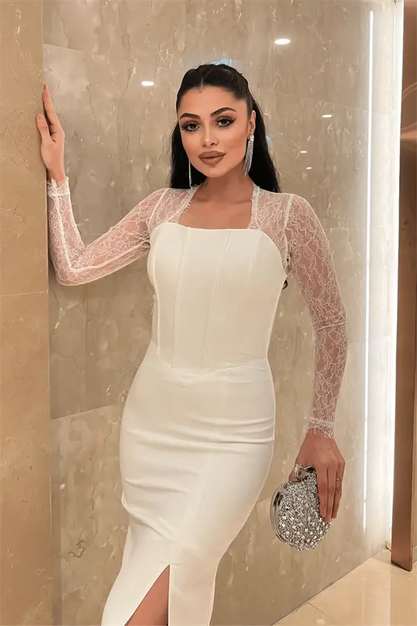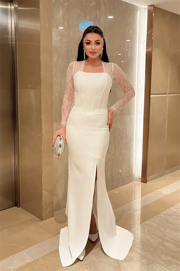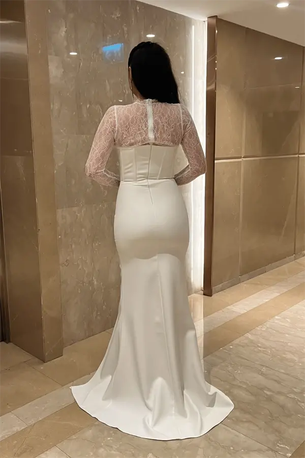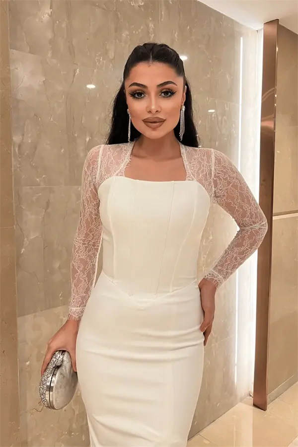Atlas Kumaş Dantel Detaylı Korseli Abiye Elbise - BEYAZ