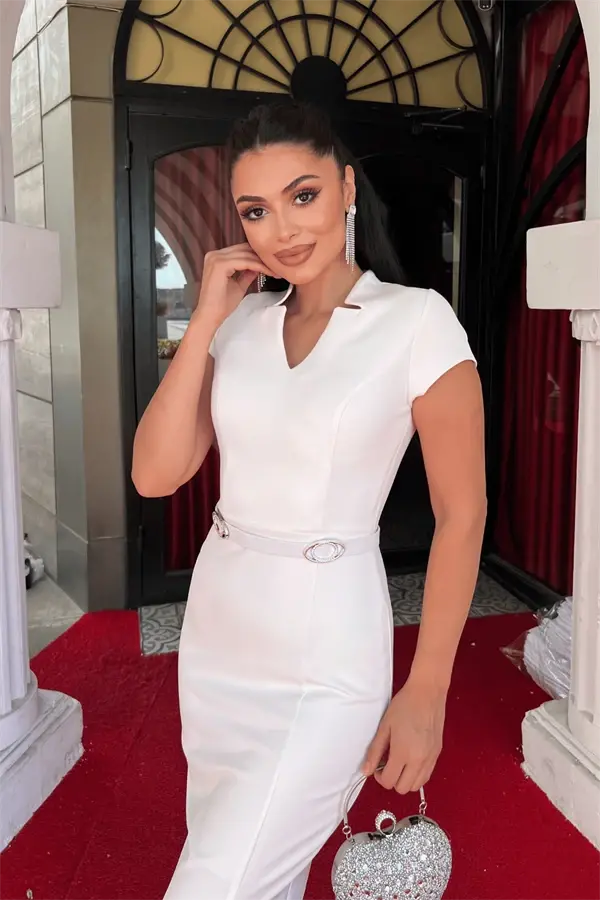 Atlas Kumaş Kemer Detaylı Kalem Elbise - BEYAZ