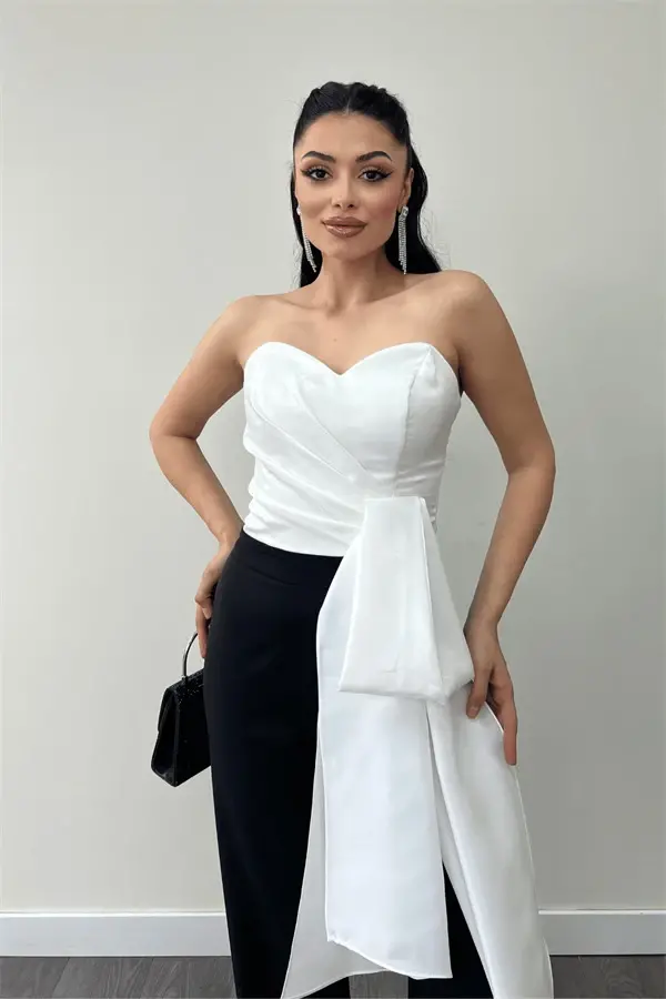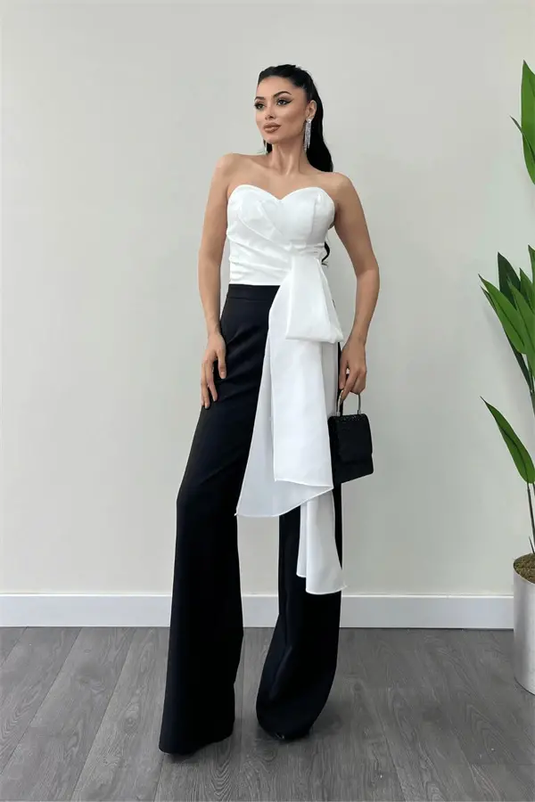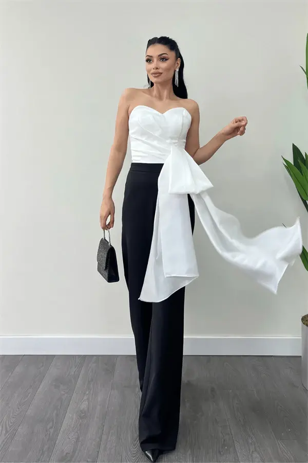 Atlas Kumaş Saten Detaylı Straplez Abiye Tulum - BEYAZ/SİYAH