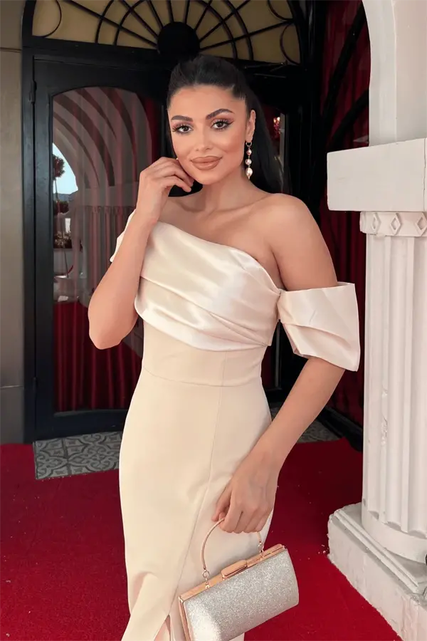 Atlas Organza Fabric Boat Neck Evening Dress - BEIGE has a design that will highlight your elegance and style on your special occasions. This beige evening dress combines the luxurious texture of atlas fabric and the lightness of organza fabric, making you shine like a star. The boat neck detail elegantly reveals your shoulders, adding a modern and sophisticated touch to the dress. The long and flowing skirt cut allows you to move freely while helping you create a chic silhouette.One of the striking features of the dress is the hidden zipper detail on the side. Thanks to this, the dress can be easily put on and taken off, while offering a perfect look. The lining inside allows you to feel comfortable all day long while protecting the quality of the outer fabric. In addition, the bustier detail in the chest provides extra support, helping you achieve a more beautiful posture.Atlas Organza Fabric Boat Neck Evening Dress is a versatile piece that you can easily choose for many different events, from special invitations to weddings, engagement ceremonies to cocktail parties. The beige color can be easily combined with different accessories and shoes, so you can reflect your own style. Whether you complete it with a stylish necklace and heels for a classic look, or create a different style with more modern and minimalist accessories. This dress will offer you perfect elegance in any case.This dress, which gently emphasizes your body lines thanks to its slightly narrow cut, does not compromise your comfort. The slit detail of the product provides ease of movement, while allowing you to elegantly display your legs. Thanks to its high-quality material and careful workmanship, it will be one of the indispensable pieces of your wardrobe for many years. Dazzle in every environment and create unforgettable memories with the Atlas Organza Fabric Boat Neck Evening Dress. Be sure to try this dress, which is the perfect combination of elegance, style and comfort!