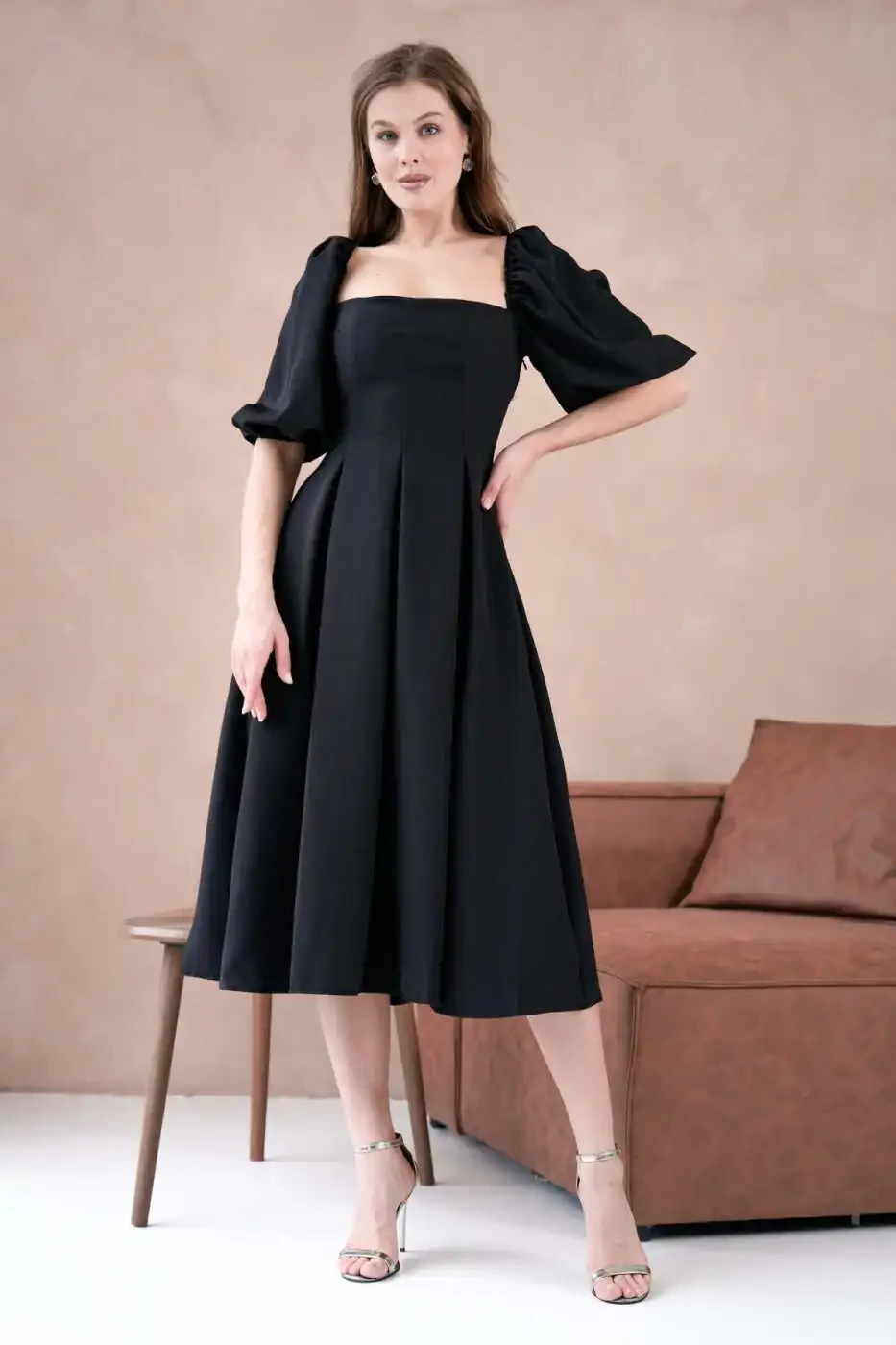 Платье миди без бретелек | Модное вечернее платье с рукавами-буфами | Платье для вечеринок и выпускного вечера