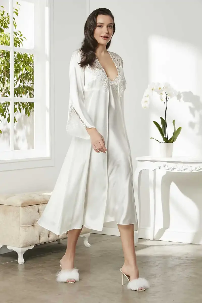 Tush kabi uyqu tajribasini yaratish uchun mo'ljallangan, atlas matodan tikilgan 6 qismli kelin chayziga to'plami. Atlas tunika, xalat, pijama ko'ylagi, pijama shim va qisqa shim to'plami bilan har bir ehtiyojga javob beradigan ushbu to'plam o'zining nafis dizayni va qulayligi bilan sizni maftun etadi.