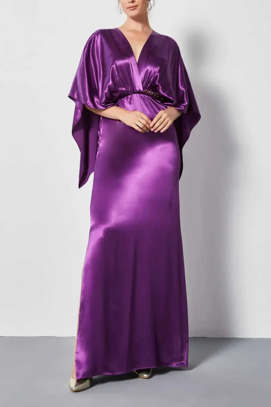 Satin V Bo'yinli, Bel Bog'lamali, Yirtilgan Uzun Kechki Libos binafsha