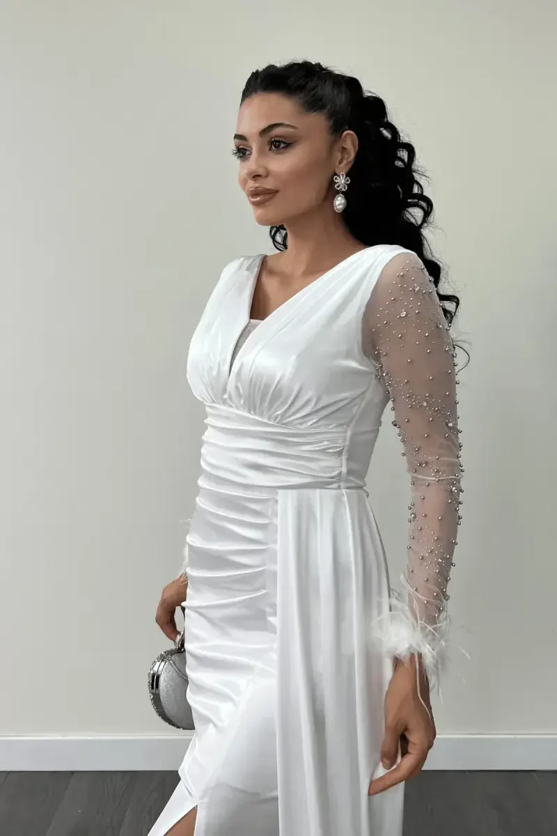 ОПИСАНИЕ ТОВАРА = Это платье силуэта "русалка", созданное с элегантностью атласной ткани и очаровательным прикосновением страусиных перьев, позволит вам приковывать к себе взгляды в особые дни. Дизайн, оживленный вышивкой бисером, идеально подчеркивает ваш женственный силуэт, а благородство белого цвета подчеркивает вашу элегантность. Это платье, в котором вы сможете продемонстрировать свой стиль на любом мероприятии, от свадеб до помолвок, от специальных приемов до коктейлей, станет незаменимым предметом вашего гардероба.Описание товараАтласное платье силуэта "русалка" с рукавами, отделанными страусиными перьями и бисером, отличается особым дизайном, сочетающим в себе элегантность и стиль. Плавность и блеск атласной ткани придают платью изысканный вид, а крой силуэта "русалка" наилучшим образом подчеркивает изгибы вашей фигуры. Страусиные перья на рукавах придают платью движение и игривость, а вышивка бисером добавляет искрящийся штрих. Невинность и благородство белого цвета объединяются в этом особом дизайне, помогая вам создать незабываемый образ. Это платье - идеальный выбор для различных мероприятий, таких как званые вечера, свадьбы, помолвки и коктейли. Изысканные детали и стильный дизайн платья выделят вас в любой обстановке и привлекут всеобщее внимание. Это платье очень универсально в выборе аксессуаров: вы можете дополнить свой образ жемчужными серьгами, элегантным колье и туфлями на каблуках. Кроме того, можно придать платью другой вид с помощью различных причесок и макияжа. Атласное платье силуэта "русалка" с рукавами, отделанными страусиными перьями и бисером, не только обеспечивает стильный внешний вид, но и обеспечивает комфорт при носке. Высококачественная атласная ткань позволяет вам комфортно двигаться в течение всего дня, а безупречный крой платья идеально облегает ваше тело и придает вам уверенность. В этом платье вы будете чувствовать себя не только стильно, но и уверенно и комфортно. Это особенное платье, которое обязательно должно быть в вашем гардеробе, дает вам возможность создать незабываемые воспоминания. Это платье, в котором вы будете чувствовать себя особенной и красивой каждый раз, когда будете его надевать, будет оставаться вашим фаворитом на долгие годы. Наслаждайтесь элегантностью и стилем с атласным платьем силуэта "русалка" с рукавами, отделанными страусиными перьями и бисером.Характеристики продукта* Изготовлено из атласной ткани.* Имеет крой силуэта "русалка".* Рукава отделаны страусиными перьями.* Имеется вышивка бисером.* Белого цвета.* Идеально подходит для званых вечеров и мероприятий.* Предлагает элегантный и стильный внешний вид.* Подчеркивает изгибы фигуры.* Обеспечивает комфорт при носке.* Изготовлено из высококачественных материалов.* Можно комбинировать с различными аксессуарами и прическами.* Долговечное.* Станет незаменимой частью вашего гардероба.* Позволяет вам чувствовать себя особенной и красивой.Дополнительная информация* Рекомендуется сухая чистка платья.* Товар доступен в различных размерах. Пожалуйста, сверьтесь с таблицей размеров при заказе.* Аксессуары, видимые на фотографиях товара, не входят в стоимость.* Цвета могут отличаться в зависимости от настроек вашего экрана.* Важно хранить страусиные перья бережно, чтобы не повредить их.
