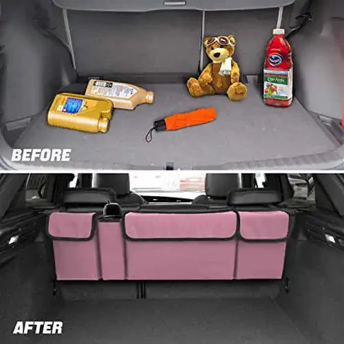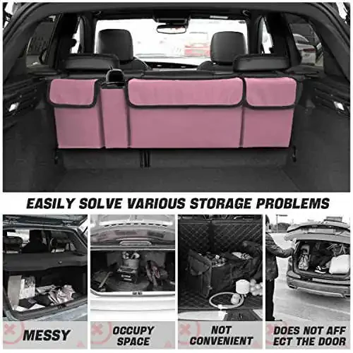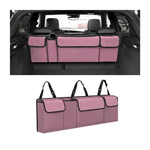 【Excellent Material】: This car trunk organizer is made of high quality 600d oxford cloth, very resistant to wear and tear. Tightly sewn, strong and durable. It has Velcro controlled opening and closing lids above the three large pockets to effectively prevent items from falling out during the trip. Three adjustable back buckle straps can be firmly hung on the rear seat headrest. 【Hanging Design】: Hanging on the rear seat headrest, passengers can easily pick up items, no longer occupy the trunk floor space, so the trunk can store large items such as luggage and strollers. No more worrying about the ground water stains and dust will dirty this storage box, especially in rainy days. It is collapsible and can be folded when not in use, taking up only a small amount of space. 【Large Capacity Storage】: It has four pockets that can hold many items such as toys, baby items, clothing, large piles of snacks and car essentials. Four pockets for sorting and organizing, so your seat and trunk are no longer cluttered and disorganized, making it easier to access items in an organized manner and making your trip more comfortable and satisfactory. 【Quick Installation】: The installation of this trunk organizer is very quick and easy, open the buckle of the back buckle strap, hang it on the rear seat headrest, then snap the buckle on. Hang all three back buckle straps in turn, then adjust them to the proper and uniform height, and you can finish the installation. 【Widely Applicable】: This organizer is 38.19 * 4.72 * 12.59 inches, it is a universal car interior accessory that can be widely used in most models in the market, such as SUV, MPV, sedan, van, truck, etc. Please buy according to the trunk length and choose the right product for you.
