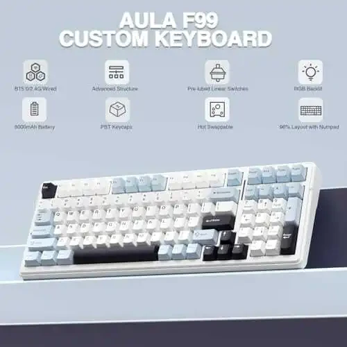 AULA F99 Simsiz Mexanik Klaviatura, Simsiz Klaviatura, Mexanik Klaviatura, Issiq almashtiriladigan tugmalar, Oldindan moylashtirilgan tugmalar, Shisha tuzilmasi, RGB orqa fon yorug'ligi, O'yin klaviaturasi, Kompyuter klaviaturasi