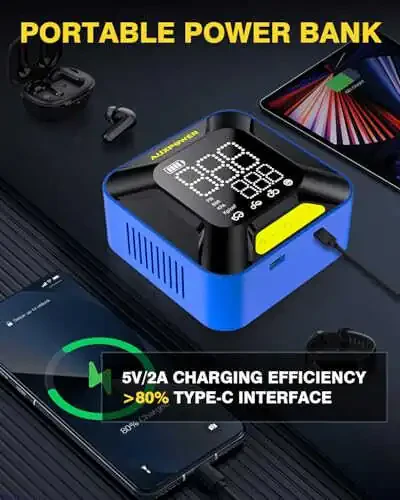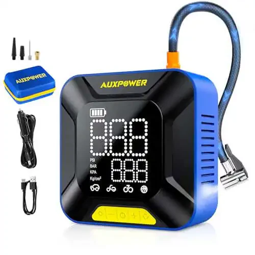 AUXPOWER Taşınabilir Hava Kompresörü ile tanışın – aracınız, motosikletiniz, bisikletiniz ve hatta spor topları için ideal bir çözüm! Bu güçlü ve taşınabilir hava pompası, 28 mm'lik büyük silindiri ve yüksek güçlü fırçalı saf bakır motoru ile geleneksel hava pompalarından 4 kat daha hızlı şişirme sağlar. 150 PSI'a kadar maksimum basınç ve 40 L/dakika hava debisi ile 30-36 PSI arasındaki bir araba lastiğini 58 saniyeden daha kısa sürede şişirebilirsiniz. Pick-up'lar, arabalar, motosikletler, bisikletler, toplar ve şişme botlar gibi çeşitli araçlar ve ekipmanlar için uygundur (tırlar için uygun değildir). Ancak bu sadece başlangıç! AUXPOWER, dahili 7800 mAh lityum pil ile sürekli 30 dakikalık çalışma süresi sunar. Ayrıca, dahil olan DC 12V güç kablosuyla da çalıştırabilirsiniz. Çift güç modu, pil bitmesi gibi acil durumlarda bile yolculuğunuza kolaylık sağlar. Yüksek hassasiyetli sensör çipi ve büyük çift LCD ekranı sayesinde gerçek zamanlı basınç değerlerini ve önceden ayarlanmış basıncı anında görebilirsiniz. Önceden ayarlanan hava basıncına ulaşıldığında otomatik olarak kapanma özelliği, aşırı şişirmeyi önler. Üstte bulunan LED acil durum ışığı karanlıkta kullanım kolaylığı sağlar ve SOS uyarı modu sunar. 5V/2A USB çıkış/giriş bağlantı noktası sayesinde telefonunuzu şarj edebilirsiniz ve tersine güç verebilir, acil bir güç kaynağı görevi görebilir. 4 önceden ayarlanmış mod + özel mod ile kolay tek dokunuşla kullanım sunar. Araba lastikleri, motosiklet veya bisiklet iç lastikleri, basketbol ve şişme botlar gibi çeşitli şişirme ihtiyaçlarını karşılamak için 4 farklı uç bulunur. PSI, KPA, BAR, KG/CM² birimleri arasında tek bir düğmeyle kolayca geçiş yapabilirsiniz. Özenle tasarlanmış ısı dağılım yapısı, dahili soğutma fanı ve yüksek sıcaklığa dayanıklı PVC gövde + ısı dağılım havalandırmaları ile güvenli kullanım sağlar. Sıradan plastik gövdelere göre çok daha üstündür. AUXPOWER araba lastiği hava pompası, sevgiliniz, eşiniz veya babanız için harika bir hediye olacaktır. Herhangi bir sorunuz olursa, lütfen bizimle iletişime geçin ve çözüm için elimizden gelenin en iyisini yapacağız. İpucu: Karavanlar veya büyük endüstriyel araçlar gibi ağır hizmet tipi araç lastikleri için uygun değildir.