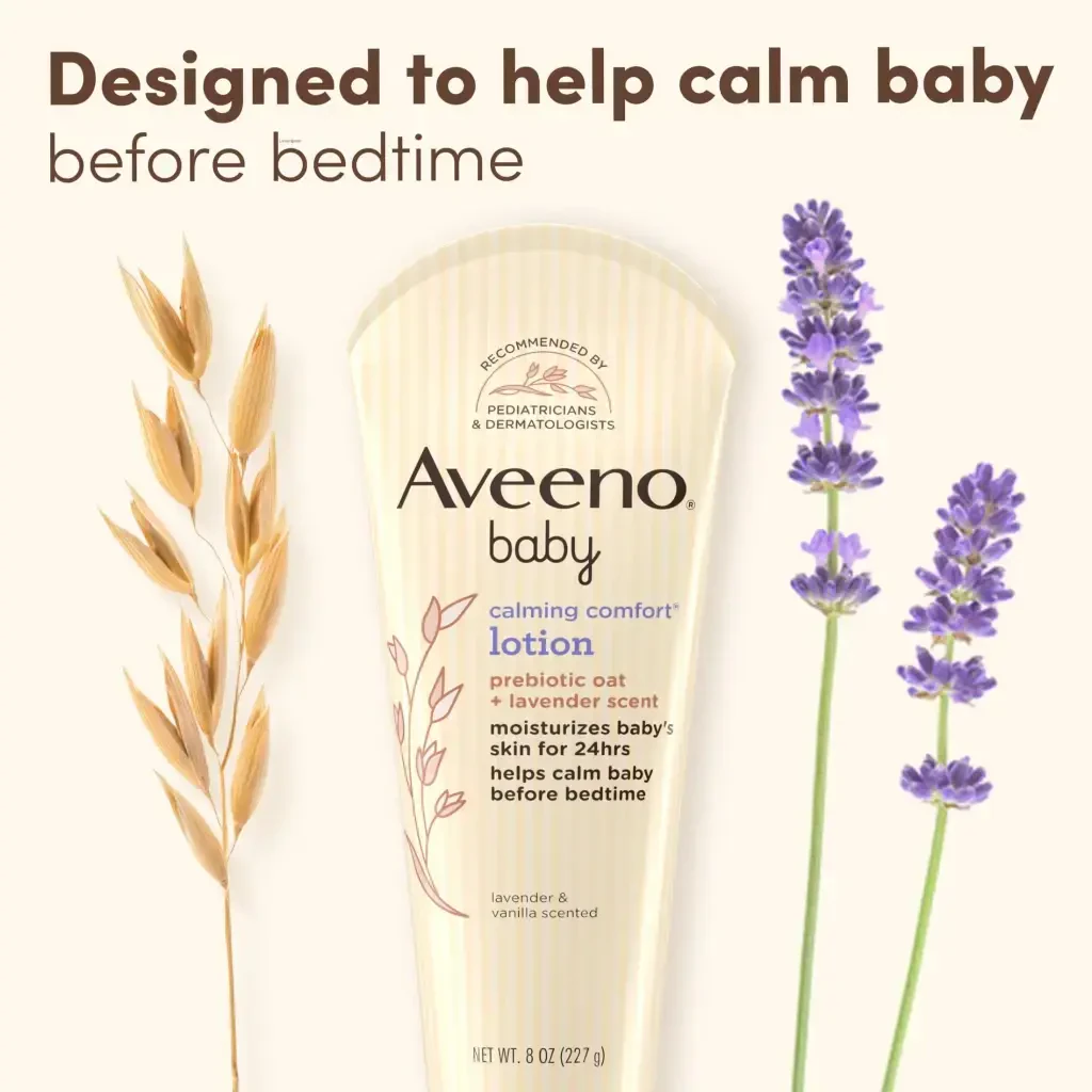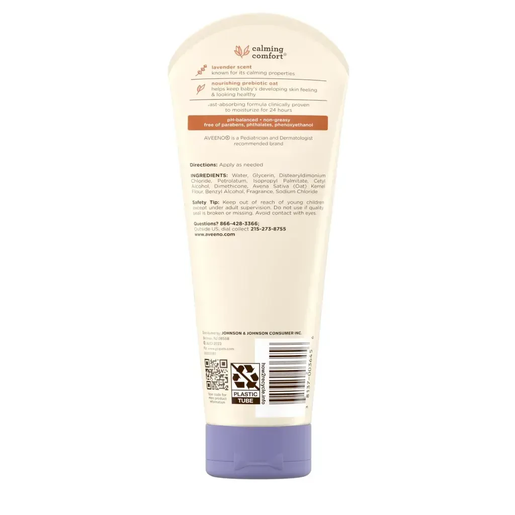 Aveeno Baby Calming Comfort Moisturizing Body Lotion helps moisturize baby's developing skin & relax them at bedtime. Aveeno Baby Calming Comfort Moisturizing Body Lotion with relaxing scents of lavender & vanilla moisturizes baby's skin for 24 hours. This non-greasy baby lotion features nourishing prebiotic oat to help keep developing skin feeling & looking healthy. The fast absorbing nighttime lotion is formulated with calming scents of lavender & vanilla to help calm baby before bedtime. Suitable for delicate skin, this soothing lavender baby lotion can be used for gentle massage, which is clinically shown to relax babies & improve their overall well-being. Aveeno Baby Calming Comfort Body Lotion is clinically proven to moisturize dry skin for 24 hours. Aveeno moisturizing bedtime lotion is recommended by pediatricians & dermatologists, plus, is pH balanced & formulated free of parabens, phthalates & phenoxyethanol to care for your little one's delicate skin.