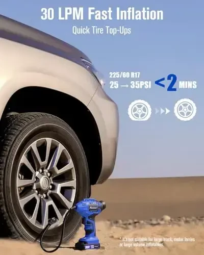 For optimal durability of the product, it is recommended to let it cool down for 3 minutes after 10-15 minutes of continuous use. A fully charged battery can inflate approximately 4 195/60R14 or 3 215/60R16 tires from zero to 36PSI. Package contents: Cordless tire inflator pump, 20V Lithium-ion battery, 12V car power adapter, battery charger, 3 nozzles (including Schrader to DV Presta valve bicycle valve adapter), user manual, and a tool bag for easy storage.