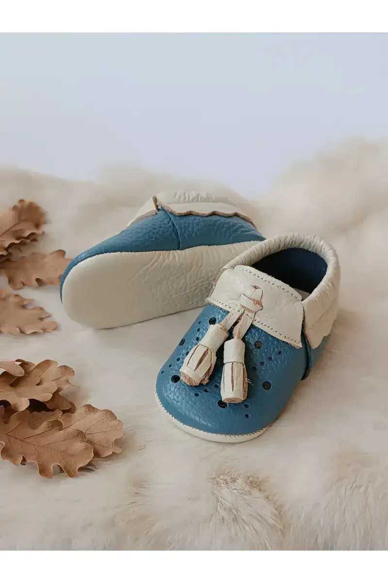 Bebek mokasin, haqiqiy teri, ko'k krem, chaqaloq poyabzali, ilk qadam poyafzali, teri mokasin, chaqaloq sovg'asi, qulay poyabzal, qo'lda yasalgan mokasin, chaqaloq kiyimi