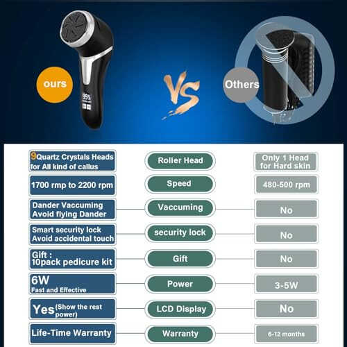 Elektr oyoq kallusini tozalash vositasi (qipiq vakuum bilan), portativ pedikür to'plami oyoq fayli kallus tozalagich, qayta zaryadlanuvchi suv o'tkazmaydigan oyoq fayli oyoq parvarishi uchun o'lik teri tozalagich 9 bosh va LCD displey bilan