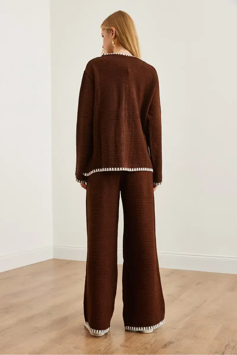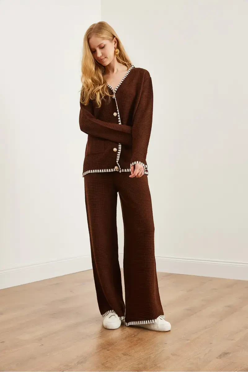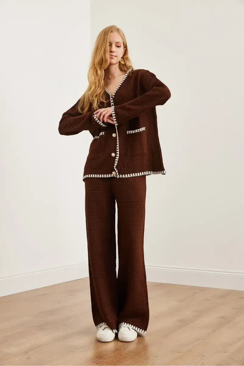 Kadın Acı Kahve Biye Detaylı Üst Hırka Alt Pantolon Triko Takım TKM-19000305-Acı Kahve, şıklığı ve konforu bir araya getiren, gardırobunuzun vazgeçilmez parçası olmaya aday bir tasarımdır. Bu özel triko takım, hem günlük kullanım hem de özel anlar için mükemmel bir seçenektir. Acı kahve renginin sıcaklığı ve biye detaylarının modern dokunuşu, bu takımı diğerlerinden ayırır. Trendyol güvencesiyle sunulan bu ürün, kalite ve şıklığı bir arada arayan kadınlar için idealdir. Üst hırka ve alt pantolonun mükemmel uyumu, size zahmetsiz bir şıklık sunar. İster evde rahat bir gün geçirin, ister arkadaşlarınızla buluşmaya gidin, bu triko takımla her zaman stil sahibi olacaksınız. Takımın triko dokusu, gün boyu konforlu bir kullanım sağlarken, biye detayları ise tasarıma hareketlilik ve özgünlük katar. Acı kahve rengi, farklı kombinler yapmanıza olanak tanır; ister spor ayakkabılarla rahat bir görünüm elde edin, ister topuklu ayakkabılarla şık bir stil yaratın. Bu takım, her türlü ortama uyum sağlayabilen çok yönlü bir parçadır. Üstelik, kaliteli materyali sayesinde uzun ömürlü bir kullanım sunar. Bu triko takım, sadece şık görünmekle kalmayıp aynı zamanda kendinizi iyi hissetmenizi de sağlar. Yumuşak dokusu ve rahat kesimi sayesinde gün boyu özgürce hareket edebilirsiniz. Gardırobunuzdaki diğer parçalarla kolayca kombinleyebileceğiniz bu takım, stilinizi tamamlayacak ve size her zaman özgüven verecektir. Kadın Acı Kahve Biye Detaylı Üst Hırka Alt Pantolon Triko Takım, şıklığı ve rahatlığı bir arada arayan modern kadınların tercihi olmaya adaydır. Bu eşsiz takımı hemen keşfedin ve stilinize yeni bir soluk getirin.