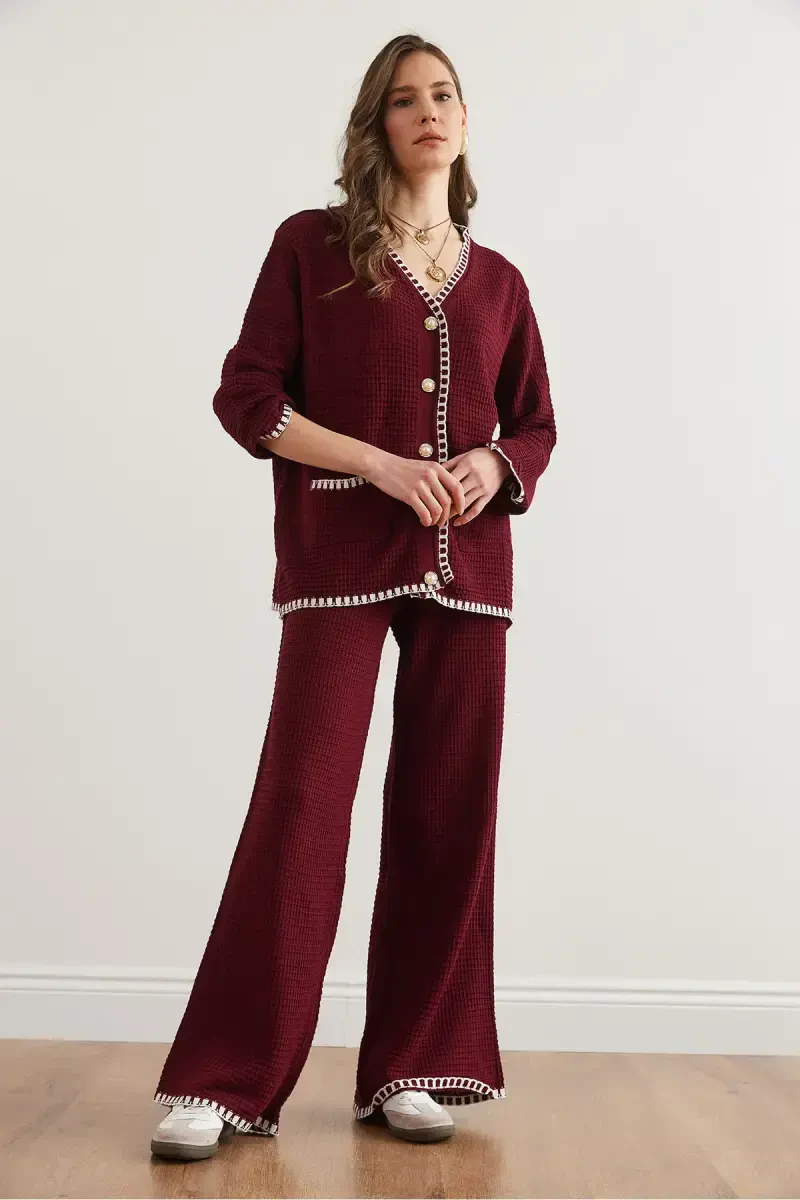 Ayollar Bordo Biye Detalli Yuqori Kardigan Pastki Shim Triko Kostyum TKM-19000305-Bordo bilan nafislik va qulaylikni birgalikda his eting. Ushbu maxsus trikotaj kostyum kundalik foydalanish va maxsus lahzalar uchun ideal tanlovdir. Bordo rangining nafisligini biye detallari bilan birlashtirgan ushbu kostyum sizning uslubingizga nafislik qo'shadi. Olalook official kafolati bilan taqdim etilgan ushbu mahsulot yuqori sifatli materiallar va ehtiyotkorlik bilan ishlashi bilan uzoq umr ko'rishni va'da qiladi. Kardigan va shimdan iborat ushbu kostyum trikotaj matoning yumshoqligi tufayli kun bo'yi o'zingizni qulay his qilishingizni ta'minlaydi. Bundan tashqari, elastik tuzilishi bilan tanangizga mukammal mos keladi va harakat erkinligingizni cheklamaydi. Uyda dam olayotganda ham, tashqarida do'stlaringiz bilan uchrashayotganda ham, ushbu kostyum bilan har doim nafis va zamonaviy ko'rinishingiz mumkin. Kombinatsiya qulayligi tufayli turli xil aksessuarlar va poyabzallar bilan to'ldirib, o'z uslubingizni aks ettirishingiz mumkin. Bordo rangining iliqligi, ayniqsa, kuz va qish oylarida garderobingizning ajralmas qismiga aylanadi. Ushbu trikotaj kostyum ham iliq tutadi, ham nafis ko'rinishingizni ta'minlaydi. Biye detallari kostyumga zamonaviy va nafis ko'rinish beradi, trikotaj matoning tuzilishi esa qulay foydalanishni ta'minlaydi. Ayollar Bordo Biye Detalli Yuqori Kardigan Pastki Shim Triko Kostyum TKM-19000305-Bordo, ham nafisligiga, ham qulayligiga e'tibor beradigan ayollar uchun ajoyib tanlovdir. Ushbu maxsus dizaynni o'tkazib yubormang va garderobingizga yangi nafas olib keling. Olalook official sifati bilan taqdim etilgan ushbu mahsulot sizning uslubingizni aks ettirish uchun ideal imkoniyatdir. Bundan tashqari, tez yetkazib berish va oson qaytarish imkoniyatlari bilan xaridlaringizni xavfsiz tarzda yakunlashingiz mumkin. Ushbu nafis va qulay trikotaj kostyum bilan har qanday muhitda e'tiborni o'zingizga torting va uslubingizni namoyish eting.