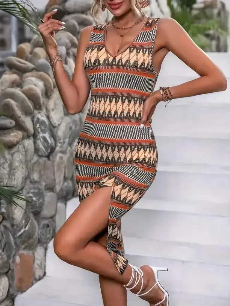 Ayollar uzun qisma V-bo'yin tugmachali midi modal ko'ylak