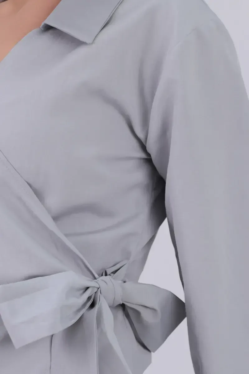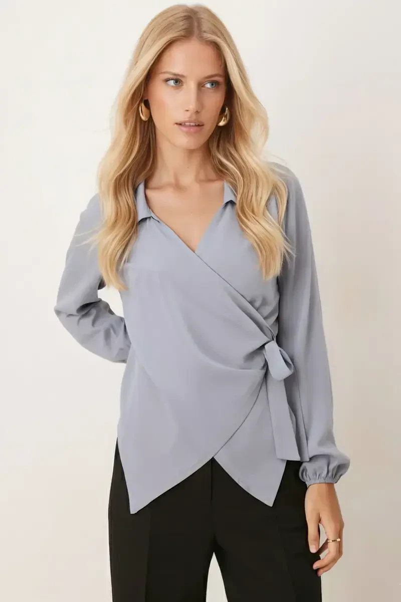Ayollar bluzkasi, kruvaze bluzka, kulrang bluzka, yoqali bluzka, chiroyli bluzka, qulay bluzka, ofis bluzkasi, maxsus kun bluzkasi, ayollar kiyimi, polyester bluzka