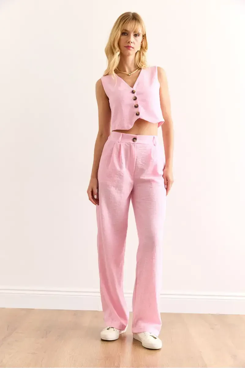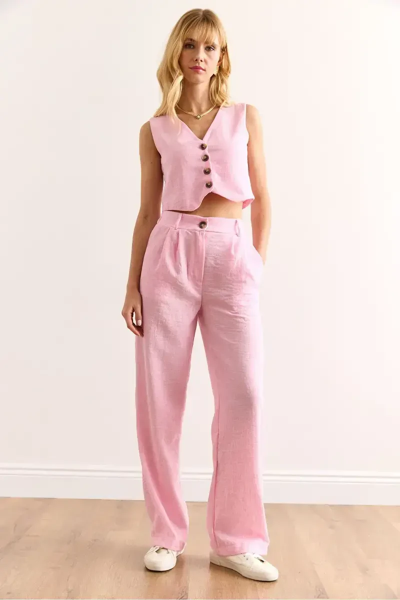 Ayollar uchun pushti rangli ustki jilet, pastki cho'ntakli shimlar, zig'ir ko'rinishidagi kostyum - bu nafislik va qulaylikni birlashtirgan maxsus dizayn. Olalook official kafolati bilan sizga taqdim etilgan ushbu kombinatsiya zig'ir ko'rinishi bilan yoz oylariga tetiklik bag'ishlasa, pushti rangi bilan ham energiya bilan to'la ko'rinishni ta'minlaydi. Ushbu maxsus dizayn kundalik foydalanishda ham, maxsus tadbirlarda ham bemalol tanlashingiz mumkin bo'lgan ko'p qirrali variantdir. Ustki jilet va pastki cho'ntakli shimlar bilan zamonaviy siluet yaratadi, harakat erkinligingizni cheklamaydigan qulay bichimi bilan esa kun bo'yi qulaylik taqdim etadi.Kombinatsiyaning eng diqqatga sazovor xususiyatlaridan biri bu zig'ir ko'rinishidagi matosidir. Ushbu mato ham nafis ko'rinishga ega, ham havo o'tkazuvchanligi tufayli issiq havoda terlashni oldini oladi. Ustki jilet - bu turli xil kombinatsiyalar bilan ishlatishingiz mumkin bo'lgan ko'p qirrali elementdir. Uni xohlasangiz alohida, xohlasangiz bluzka yoki futbolka ustidan kiyib o'z uslubingizni aks ettirishingiz mumkin. Pastki cho'ntakli shimlar esa ham foydali, ham nafis variantdir. Cho'ntaklari tufayli telefon, kalit kabi narsalaringizni yonida olib yurishingiz mumkin, qulay bichimi bilan esa kun bo'yi o'zingizni qulay his etasiz.Modeldagi S/36/1 razmer mahsulotning umumiy andozasi haqida tasavvur bersa, ko'rsatilgan o'lchamlar tufayli ham o'zingizga eng mos keladigan tanlovni qilishingiz mumkin. Ushbu nafis va qulay kombinatsiya garderobingizning ajralmas qismlaridan biriga aylanadi. Pushti rangning energiyasi va zig'ir ko'rinishining tetikligi bilan har qanday muhitda diqqatga sazovor uslub yaratishingizni ta'minlaydi. Olalook official sifati bilan taqdim etilgan ushbu maxsus dizayn ham nafislikni, ham qulaylikni birgalikda izlayotgan ayollar uchun ideal tanlovdir. O'zingizni maxsus va ishonchli his etish uchun ushbu kombinatsiyani albatta sinab ko'ring!