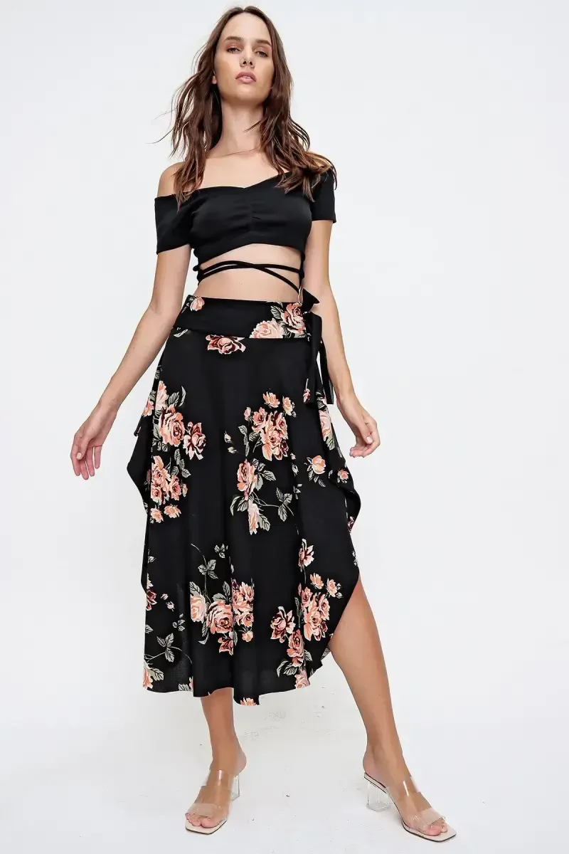 Qora gulli assimetrik yubka | Beli bog'lamali ALC-X6439