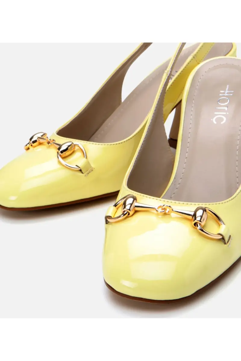 Laklangan poyabzal, sariq poyabzal, orqa qismi ochiq poyabzal, qalin poshnali poyabzal, ayollar poyabzali, chiroyli poyabzal, qulay poyabzal, charm poyabzal, poshnali poyabzal, zamonaviy poyabzal