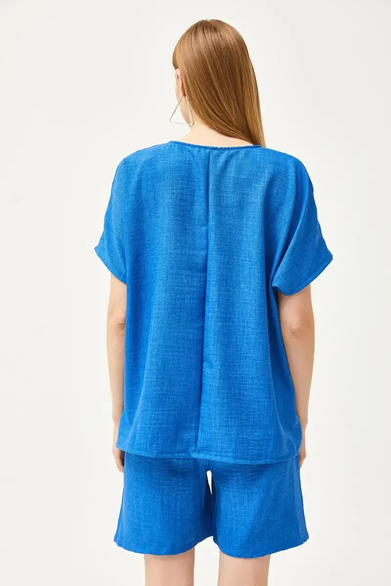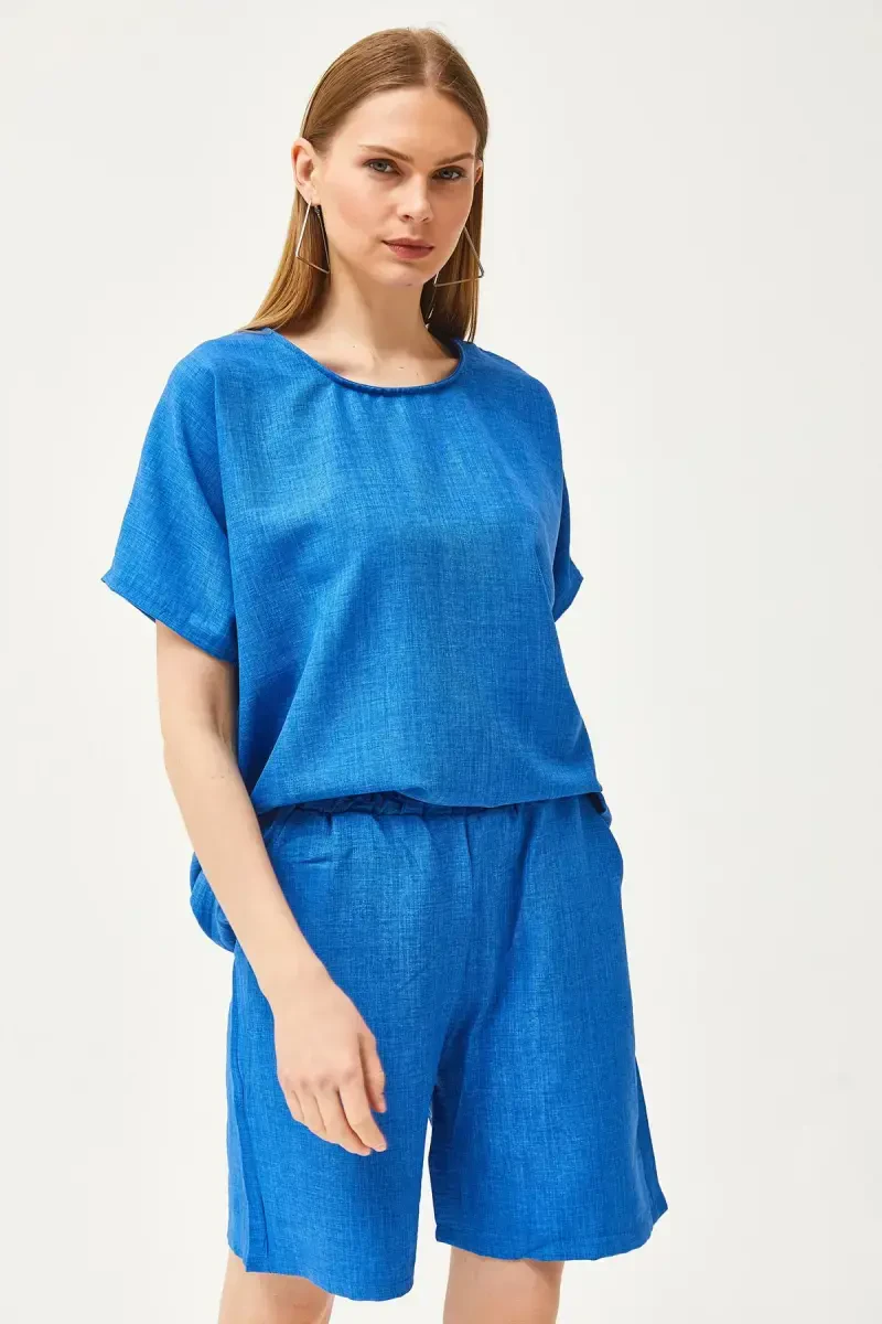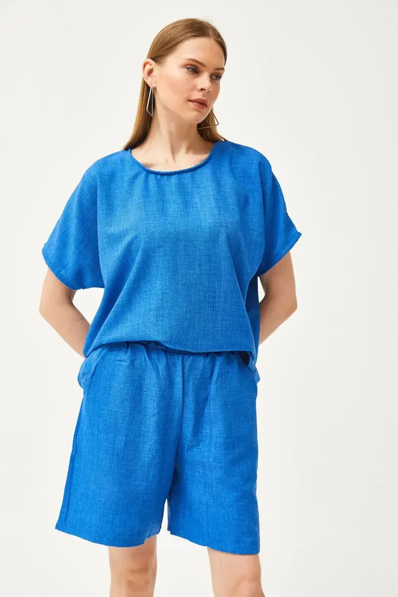 Saks Moviy Shortli Takim: Ayollar Salash Bluza & Yuqori Bel Short - %100 Paxta, Kundalik Uslub