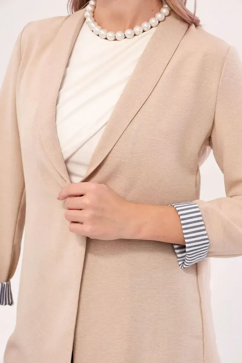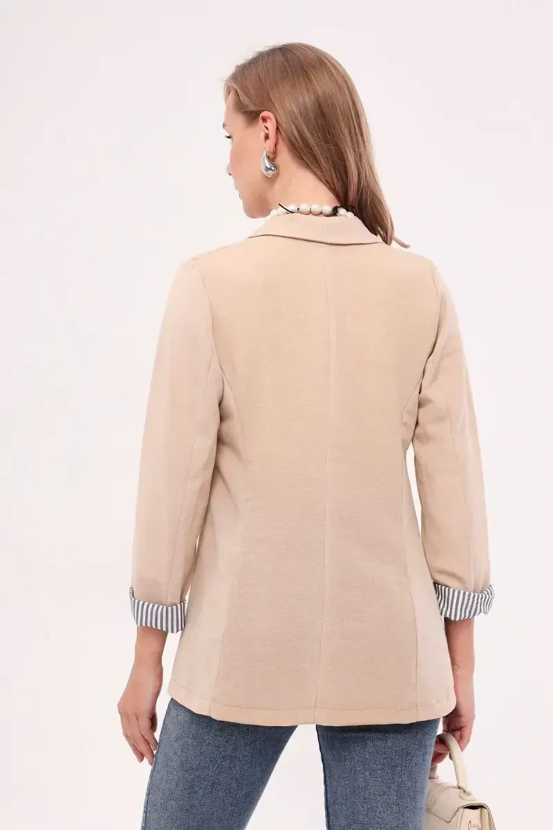 Bej Chiziqli Bitta Tugmali Ayollar Pidjaki | Polyester Viskoza Elastan