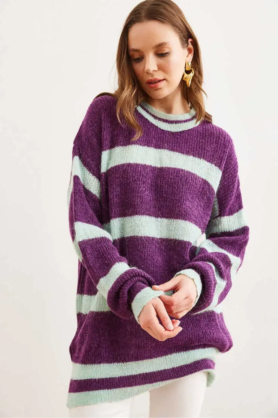 Ayollar triko kozok, binafsha kozok, yoʻl-yoʻlli kozok, velosiped yoqali kozok