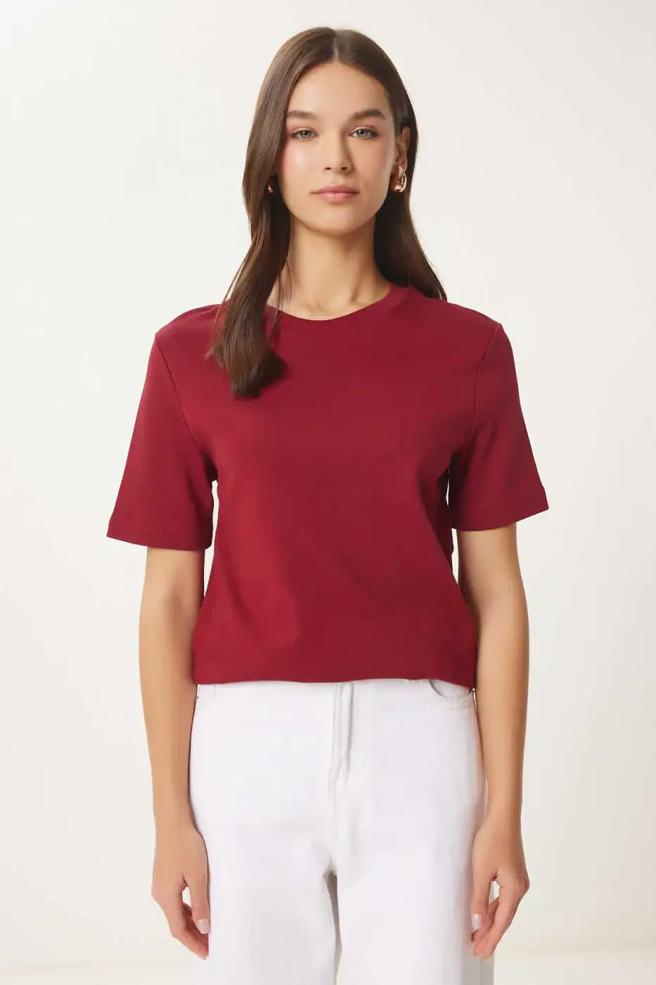 ayollar futbolkasi, bordo futbolka, paxta futbolka, asosiy futbolka, trikotaj futbolka, kundalik futbolka, ayollar kiyimi, bordo rang, paxta mato, qulay futbolka
