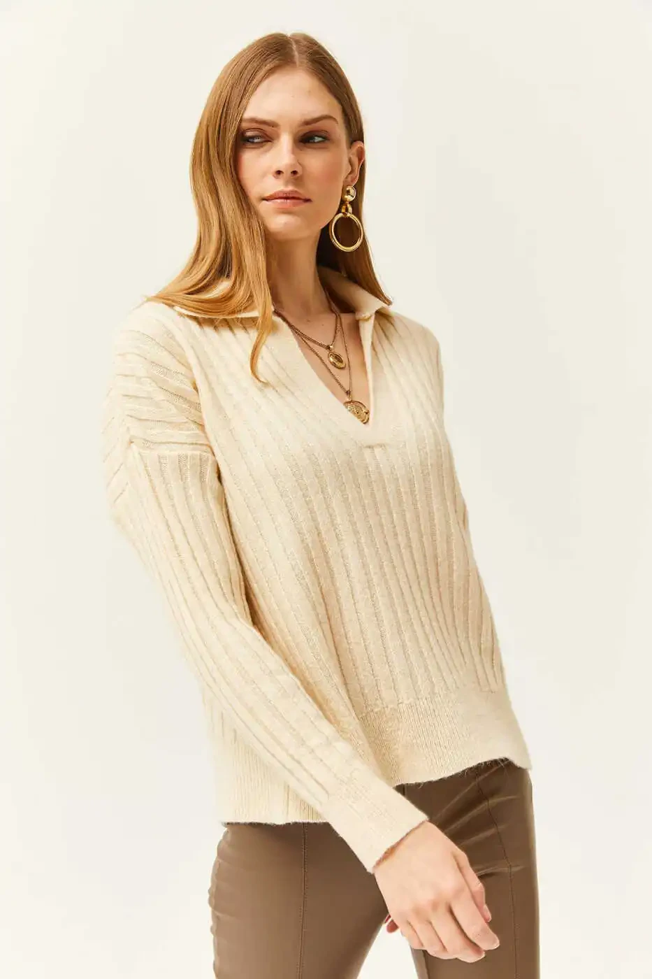 Ayollar uchun kazak, polo yoqali kazak, qalin to'qimali kazak, ekrü rangli kazak, yumshoq to'qimali kazak, kundalik kazak, casual kazak, qulay kazak, moda kazak, trend kazak