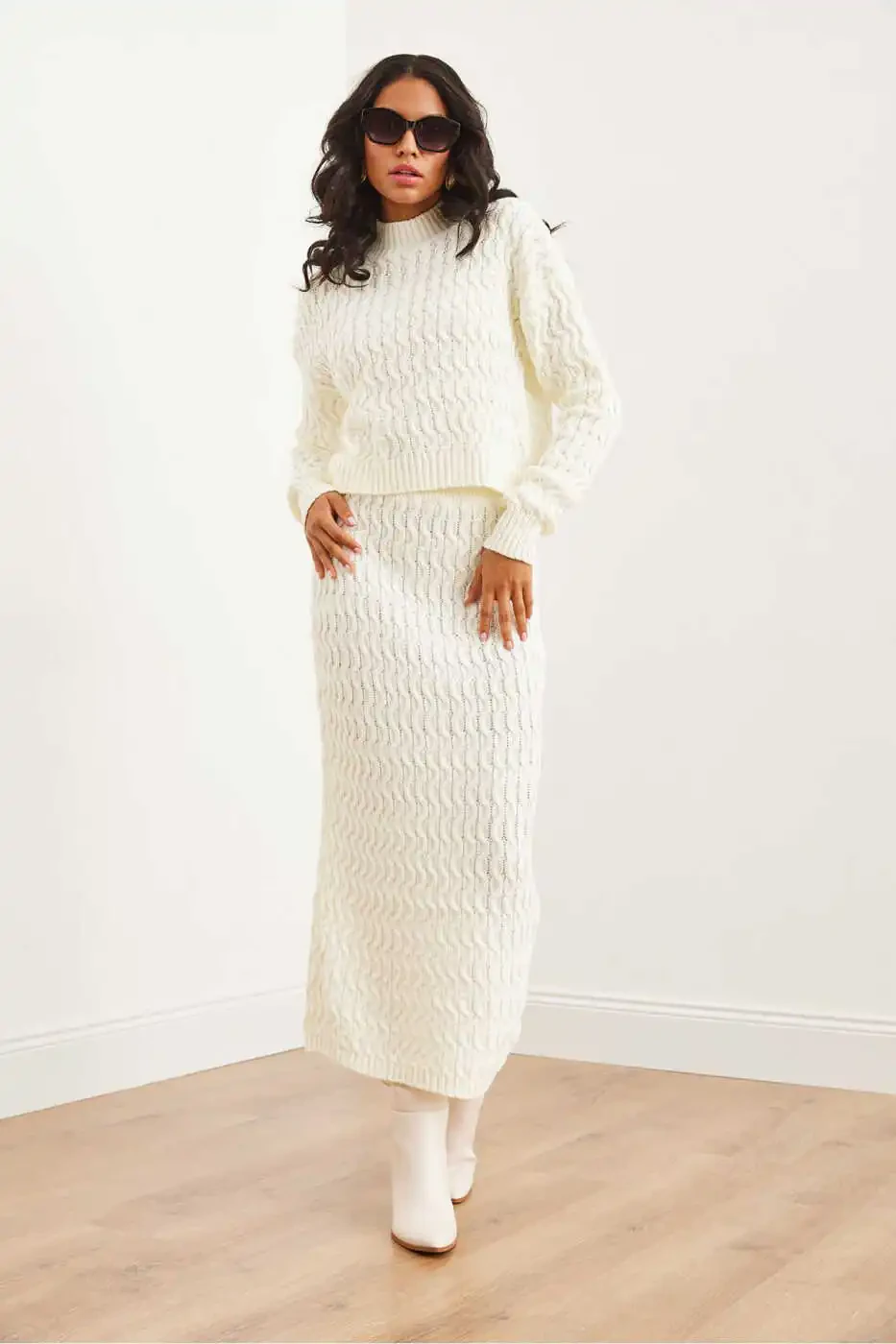 Ayollar uchun ekru rangli soch o'rgulu yuqori va pastki triko to'plam | Trendyol