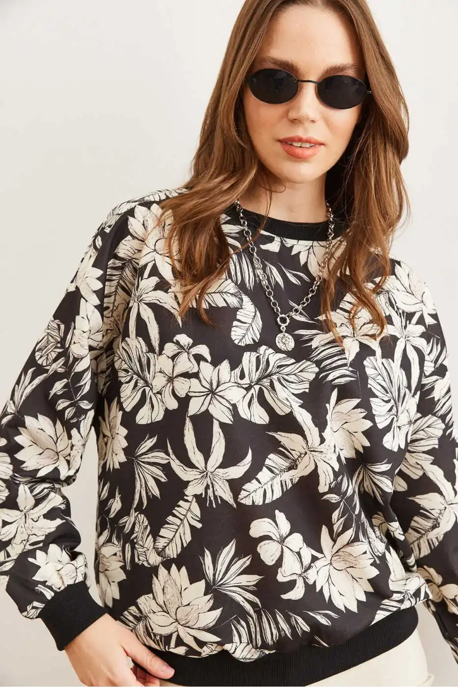 Ayollar uchun qora rangli gulli naqshli yumshoq teksturali keng svitshot