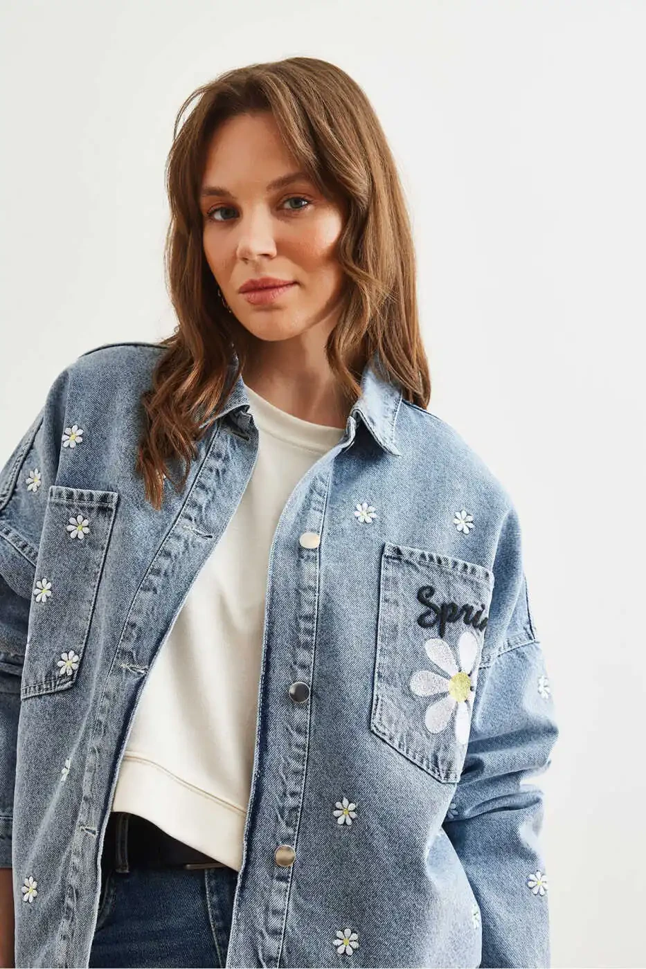 Denim kurtka, Katta denim kurtka, Ayollar uchun denim kurtka, Papatya naqshli kurtka, Ko'k kurtka, Trendyol