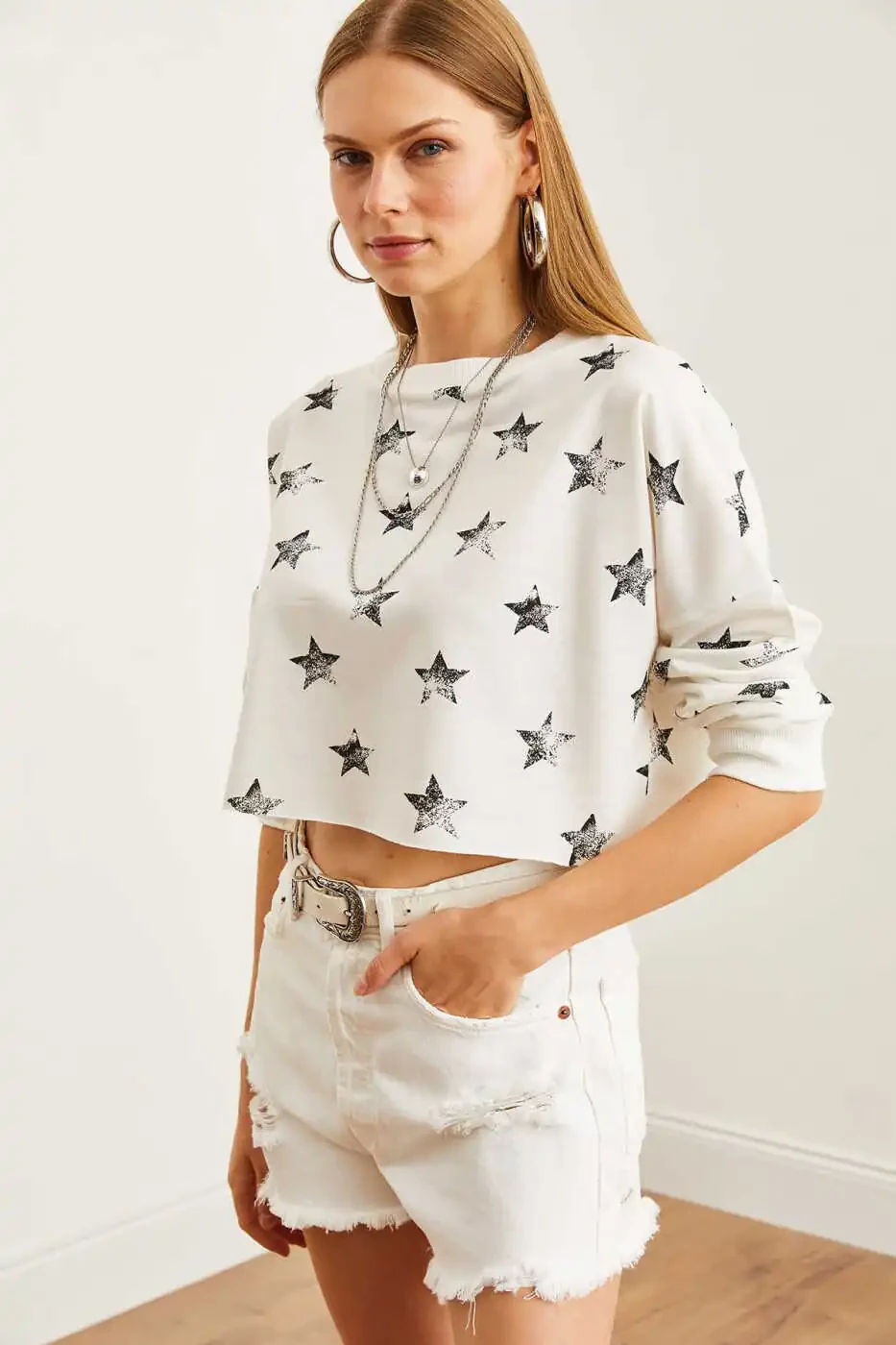 Ayollar Oq foil bilan oq rangli Crop yupqa svitshot SWT-19000652