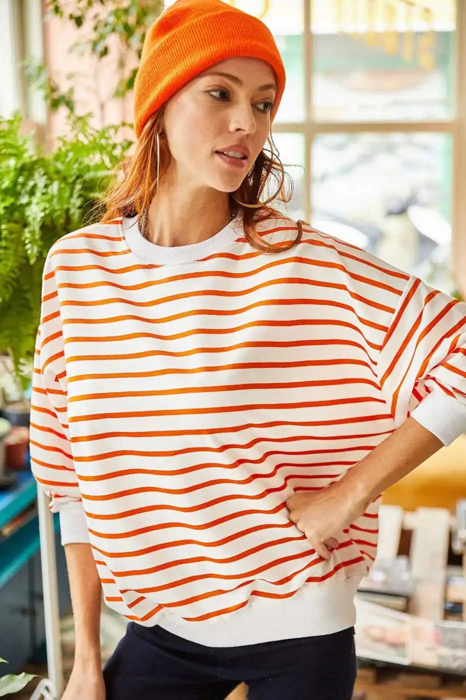 Ayollar oq va to'q sariq rangli chiziqli ko'ylak | Qulaylik va zamonaviylik