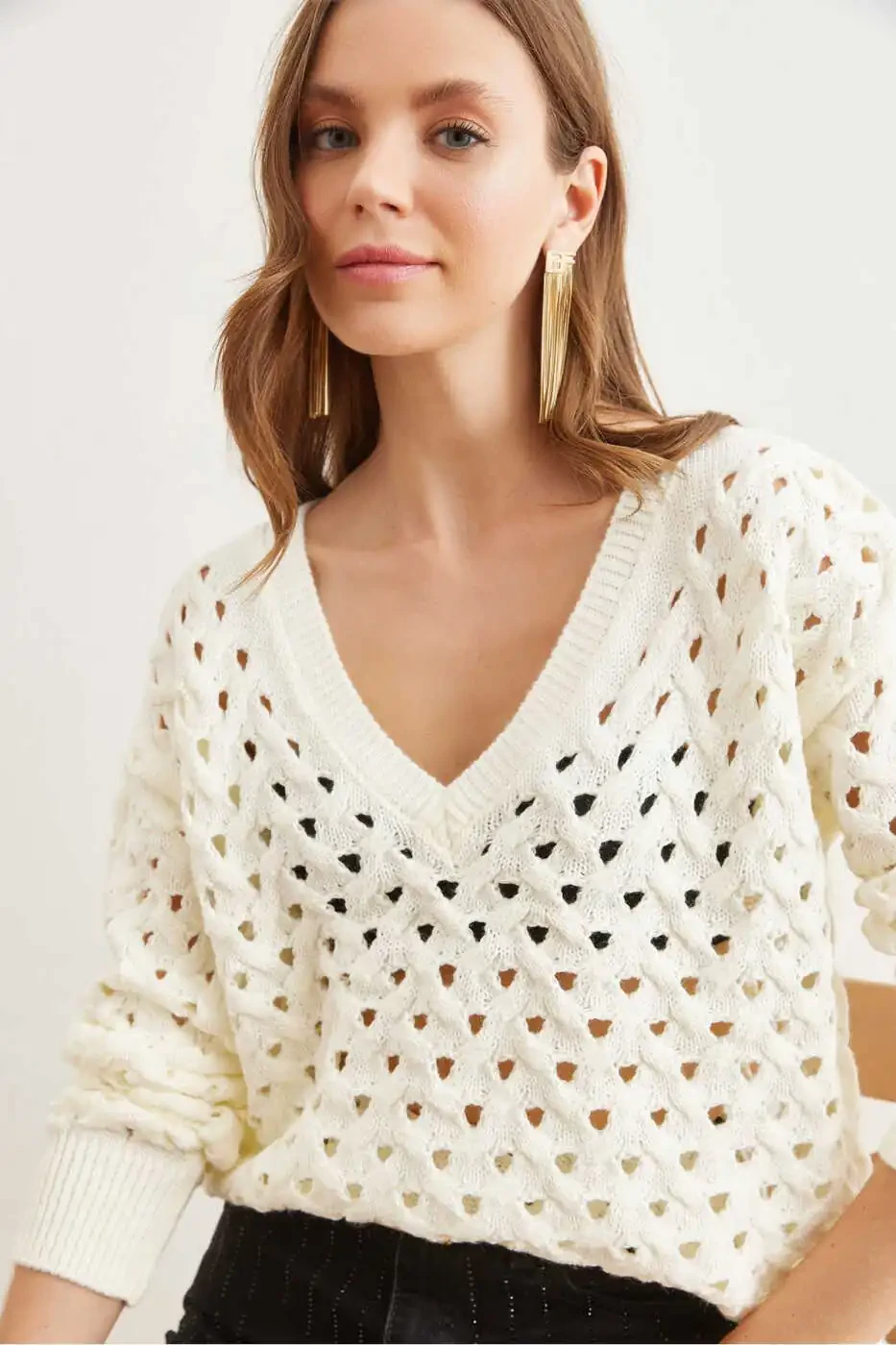 Ayollar Oq V Yaxa Ajurli Qalin Triko Kozok | KZK-19000829