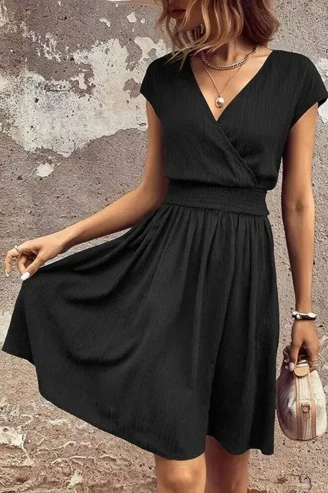 ayollar ko'ylagi, qisqa yengli, kruvaze yoqali, beli gipeli, burmali ko'ylak, mini ko'ylak, yozgi ko'ylak, chiroyli ko'ylak, kundalik ko'ylak, gipeli ko'ylak