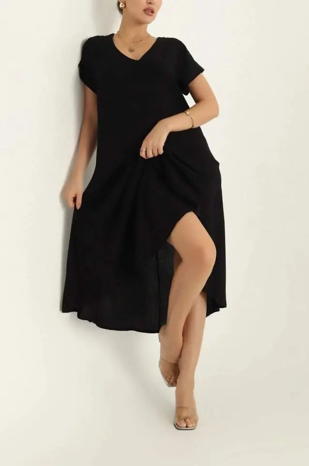 ayollar ko'ylagi, qisqa yengli, V yoqali, keng bichimli, maxi uzunlikdagi, yozgi ko'ylak, qulay ko'ylak, chiroyli ko'ylak, kundalik ko'ylak, erkin ko'ylak
