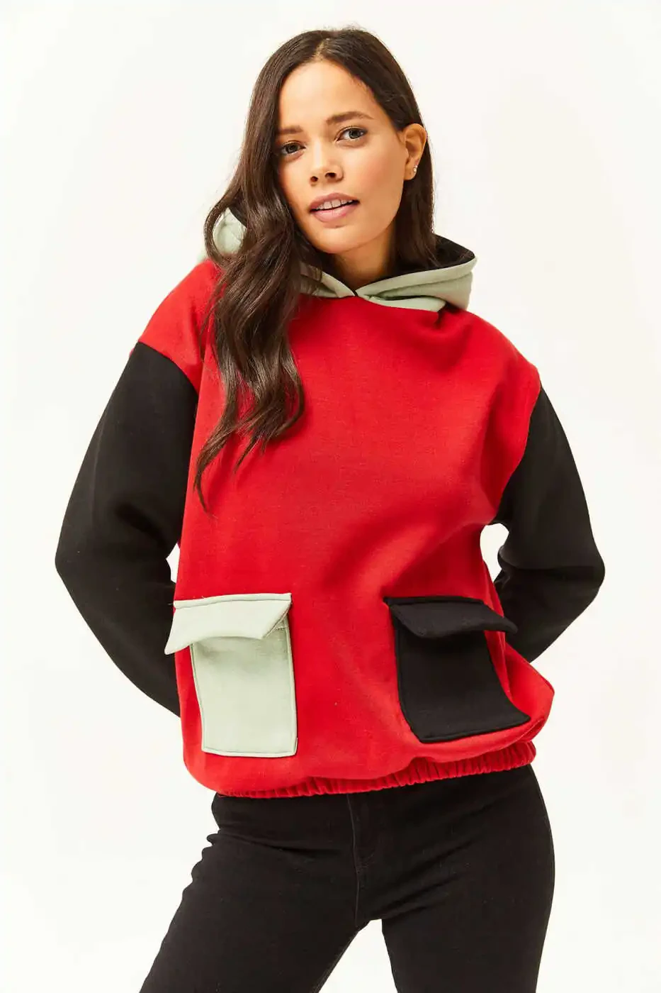 Ayollar uchun svitshot, Qizil svitshot, Suv yashil svitshot, Rang blokli svitshot, Ichki junli svitshot, SWT-19000327