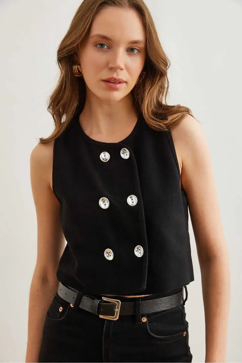 **Ayollar uchun qora ikkita kumush tugmali triko jilet YLK-19000052**