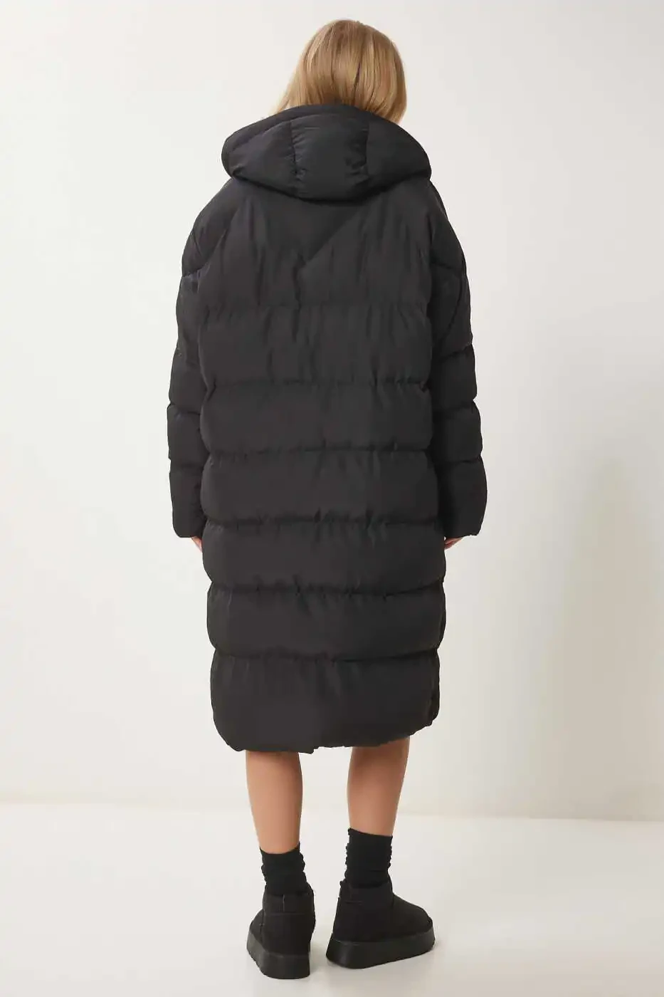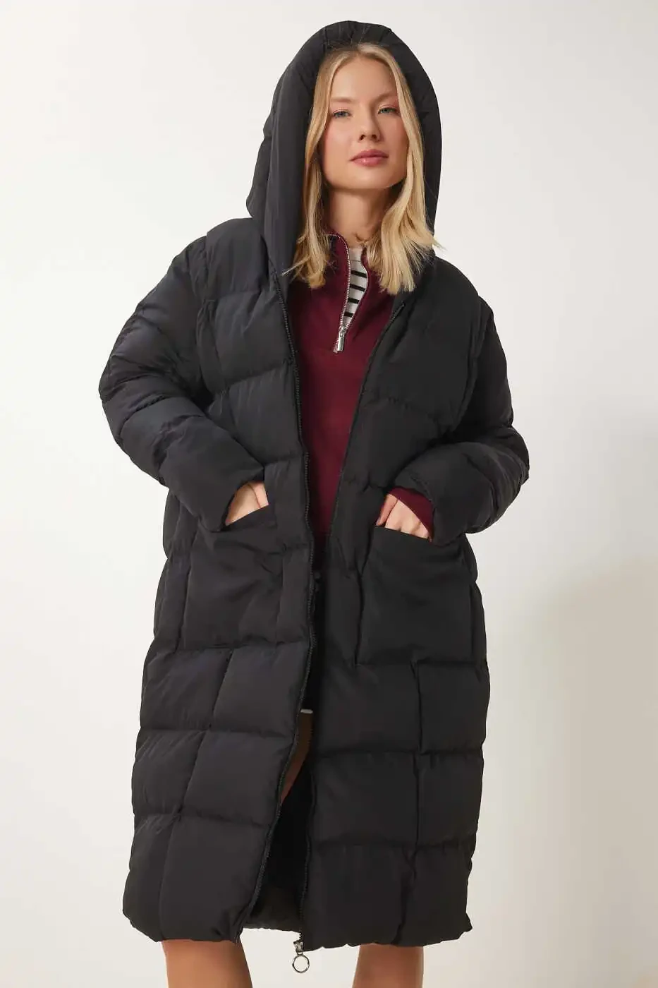 Ayollar qora kapüşonli keng uzun shishirilgan palto | Qishki kurtka