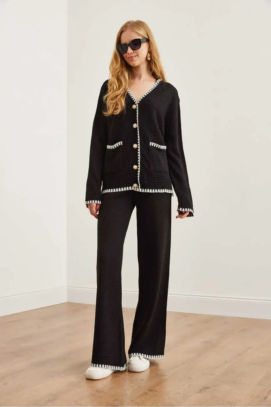 Ayollar uchun qora siyoh rangli jiyakli detallari bilan triko to'plam: hashamat va qulaylik birgalikda
