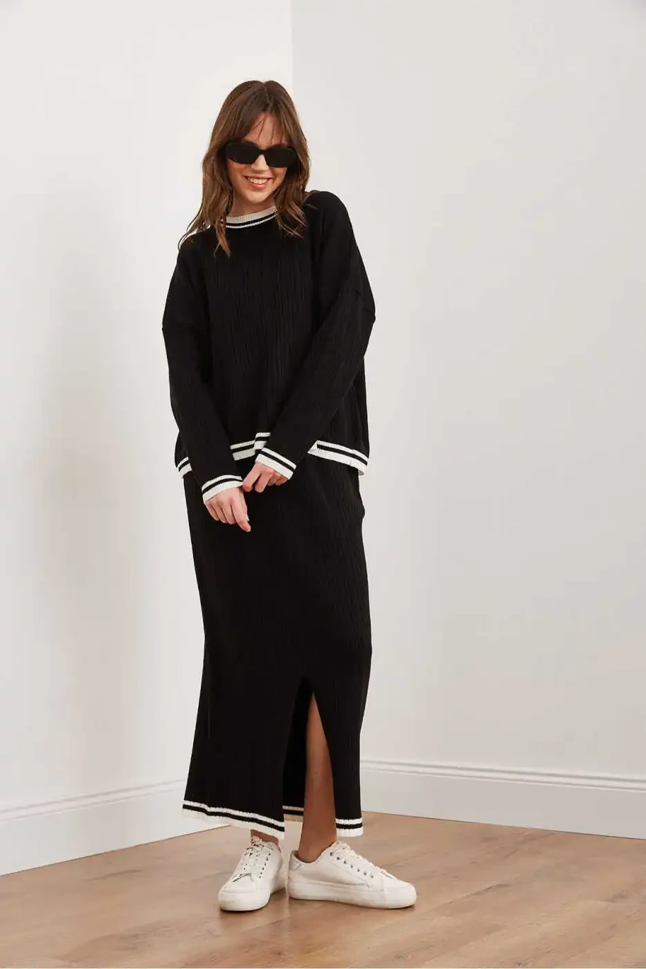 * Yirtilgan yubka detali bilan zamonaviy ko'rinish