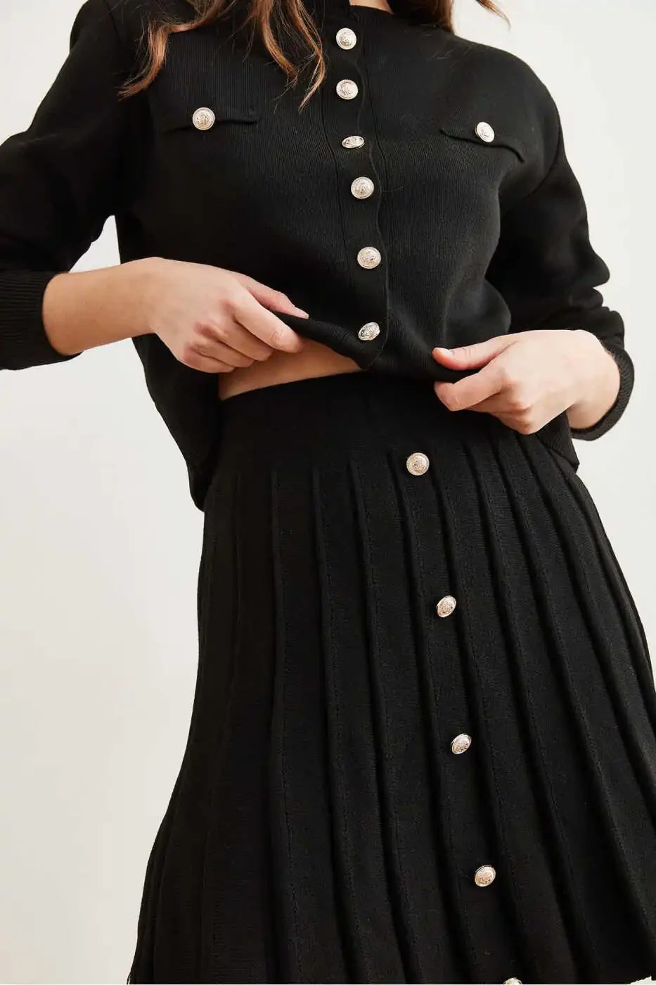 **Ayollar uchun qora tugmali bezakli yuqori kardigan pastki qavatli yubka triko to'plami**