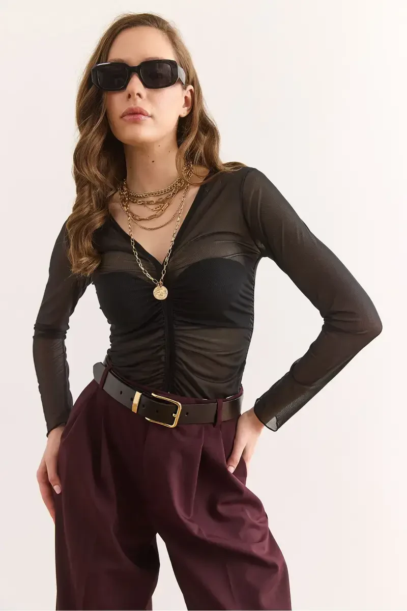 qora bluz, to'r bluz, V yoqali bluz, burmali bluz, ayollar bluzi, chiroyli bluz, shaffof bluz, maxsus kun bluzi, Blz-1900, polyester bluz