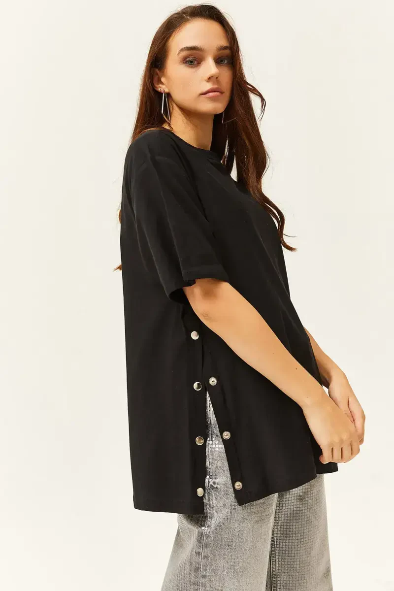 Ayollar uchun qora yon tomoni tugmachali paxtali futbolka TSH-19000 kundalik uslubingizga nafislik va qulaylik qo'shadigan buyumdir. Qulay kesimi, qisqa yengli dizayni va yon tomonlaridagi tugma detallari bilan ajralib turadigan bu futbolka tasodifiy kombinatsiyalaringizning ajralmas qismiga aylanadi. Qora rangi va tekis naqshlari tufayli uni turli xil buyumlar bilan osongina birlashtirish mumkin va shkafingizda eng ko'p ishlatiladigan buyumlardan biriga aylanadi. Xoh jinsi shimlar bilan sport ko'rinishini yarating, xoh yubkalar bilan yanada zamonaviy uslub yarating, bu futbolka har qanday muhitga mos keladi. To'quv mato tuzilishi chidamlilik va qulaylikni birgalikda ta'minlab, kun bo'yi o'zingizni qulay his qilishingizni ta'minlaydi. Asosiy kolleksiyaning abadiy qismi bo'lgan bu futbolka har bir shkafda bo'lishi kerak bo'lgan asosiy buyumlardan biridir. Bo'shashgan silueti tufayli u tanani o'ramaydi va erkin harakatlanish imkoniyatini beradi. Oddiy uzunligi turli xil tana turlariga mos keladi va qulay foydalanishni ta'minlaydi. Barcha yosh guruhlariga murojaat qiladigan dizayni bilan u keng foydalanuvchilar auditoriyasiga etib boradi. Velosiped yoqasi zamonaviy va oddiy uslubni yaratadi, shu bilan birga kundalik kiyimda nafislikni ushlashni osonlashtiradi. Ushbu futbolka ham qulaylikni, ham nafislikni qidiradigan ayollar uchun ideal tanlovdir. Kundalik foydalanish uchun mukammal tanlov bo'lgan ushbu futbolka, shuningdek, parvarishlash osonligini ta'minlaydi, shuning uchun u har doim foydalanishga tayyor. Trendyol kafolati bilan taqdim etilgan ushbu mahsulot sizga sifatli va zamonaviy kiyim tajribasini taqdim etadi. Qoraning nafisligi va tugmachalarning nafisligi bilan birlashgan bu futbolka sizning shkafingizning sevimli qismiga aylanishga nomzod. Ushbu futbolka bilan ham qulay, ham zamonaviy bo'lishdan zavqlaning. Ham kundalik faoliyatingizda, ham maxsus lahzalaringizda sizga hamroh bo'ladigan bu futbolka uslubingizni aks ettirishga yordam beradi. Paxtali matosi tufayli teringizga nafas olish imkonini beradi va kun bo'yi o'zingizni qulay his qilishingizni ta'minlaydi.